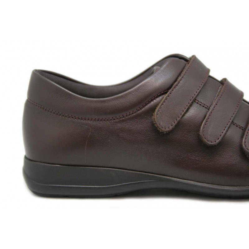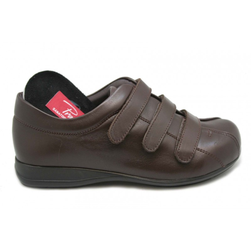 Zapato para pies diabéticos. Todo en nappa marrón con tres velcros en empeine ajustables. Forro anti alérgico. Muy suave. Sin costuras. Plantilla anatómica extraíble.
