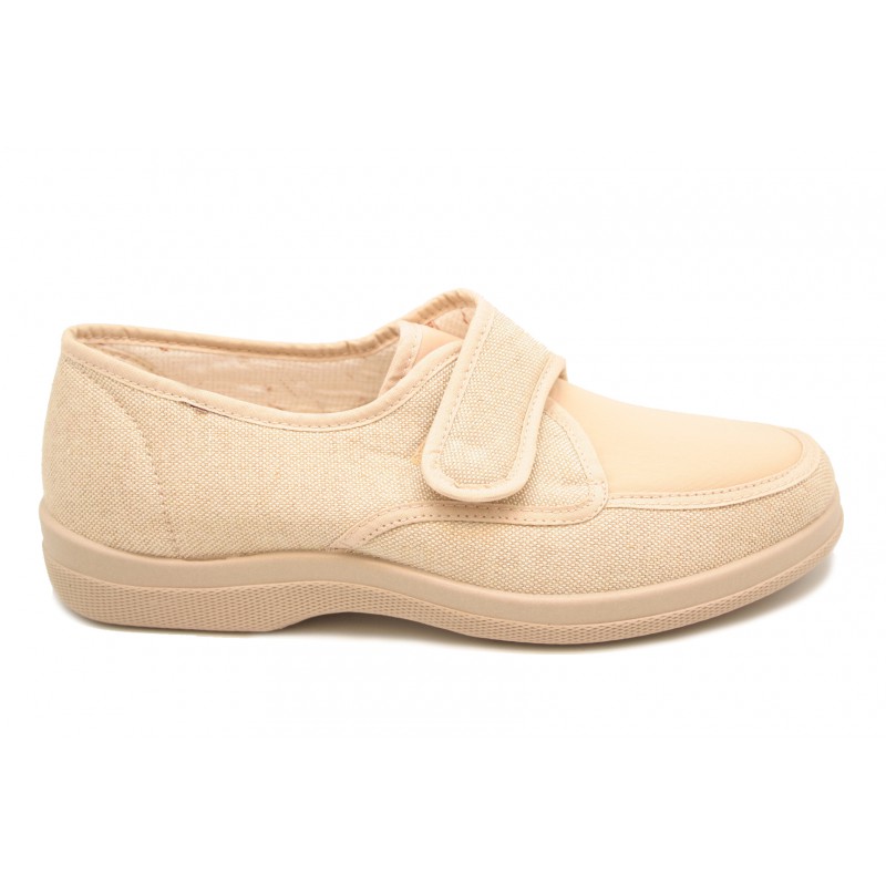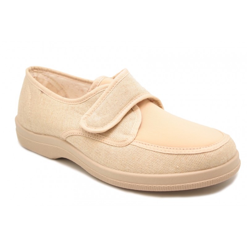 Zapatilla tipo deportivo para caballero, con velcro al empeine, fabricado en lona y lycra color beige.- Especialmente diseñado para evitar los dolores de los "dedos en garra".- MUY CÓMODO para caminar en verano.