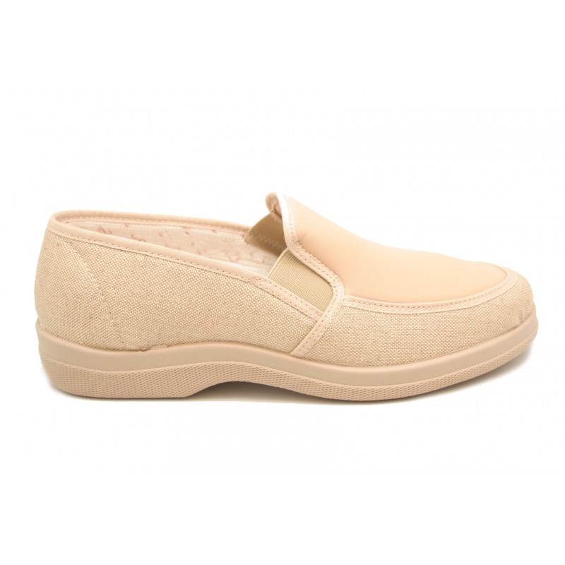 Zapato para caballero mocasín con dos elásticos al empeine.-Fabricado en lona y lycra color beige.- Especialmente diseñado para evitar los dolores de los "dedos en garra".- MUY CÓMODO.
