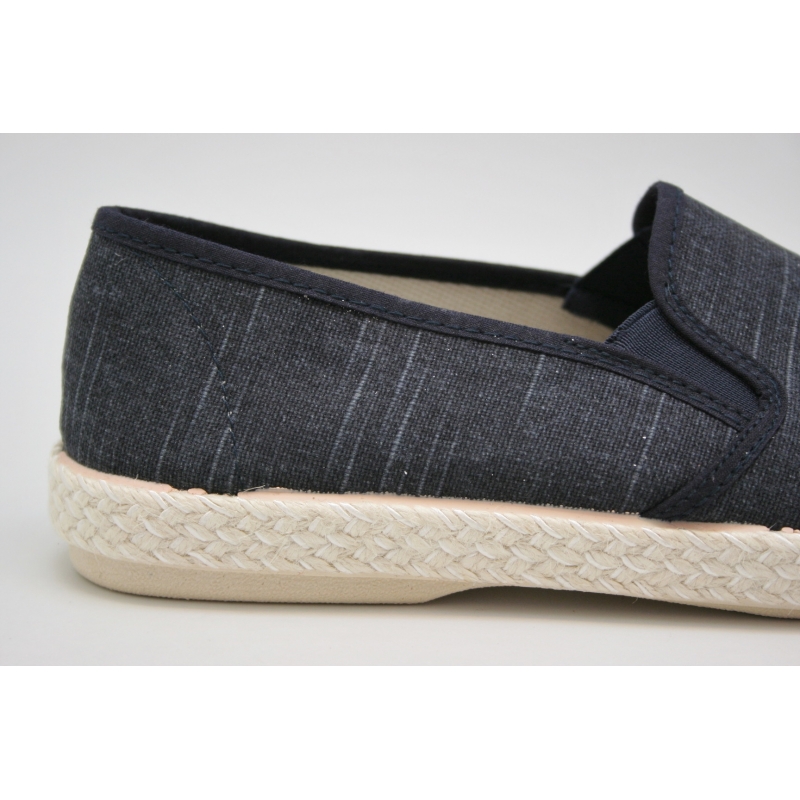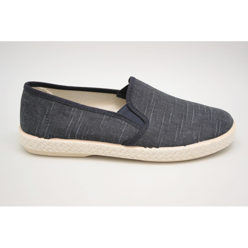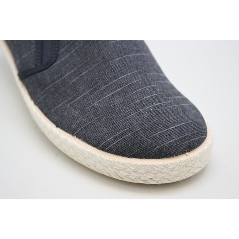 Estupendo mocasín para caballero con elásticos en el empeine.- Fabricado en un precioso tejido de saco en azul marino.- Piso antideslizante muy cómodo con bandeleta imitación esparto.