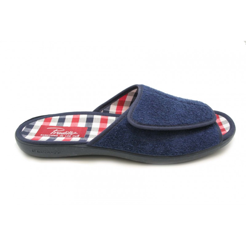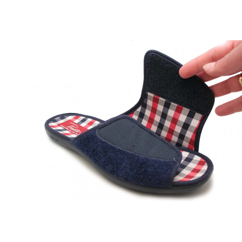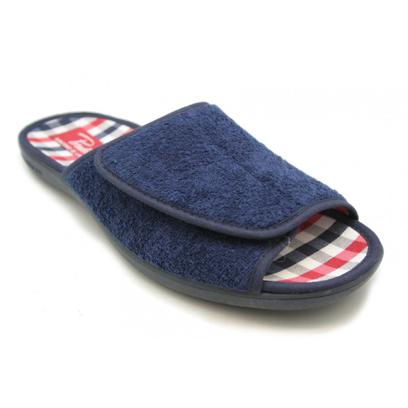 Sencilla y cómoda chancla de baño para caballero en toalla rizo azul marino. Pala "sobre" con velcro de gran apertura para pies anchos o delicados