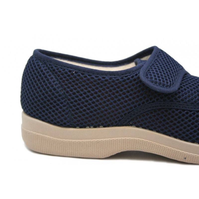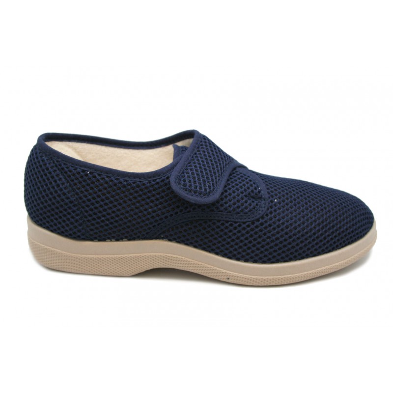 Deportivo para caballero con velcro, muy cómodo y especial para tiempo libre, fabricado en rejilla de algodón anti-alérgica y transpirable. Color azul marino con velcro ajustable al empeine.