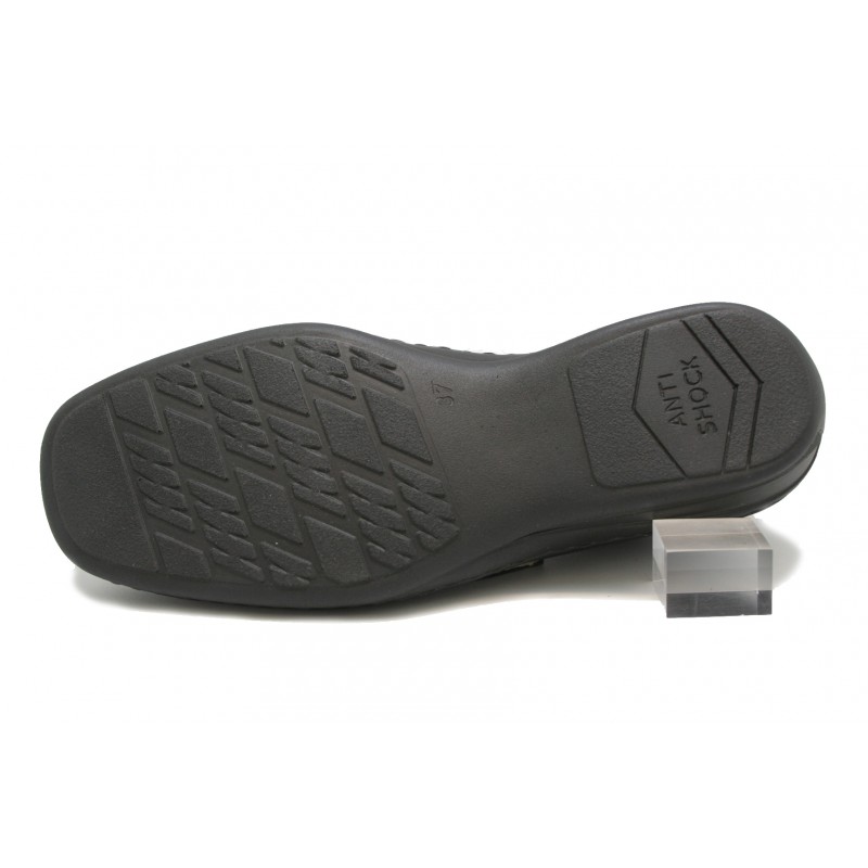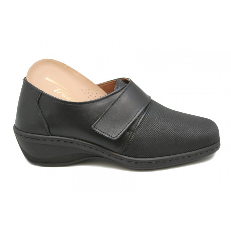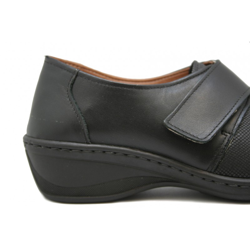 Zapato especialmente fabricado para pies diabéticos con la trasera en nappa negra y la pala totalmente lisa en lycra elástica al tono. Suave, cómodo y ancho. También recomendado para pies delicados. Velcro ajustable al empeine. Plantilla extraíble.