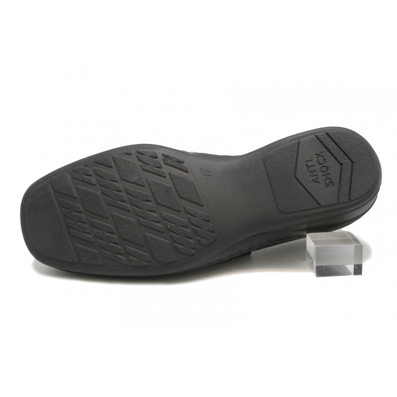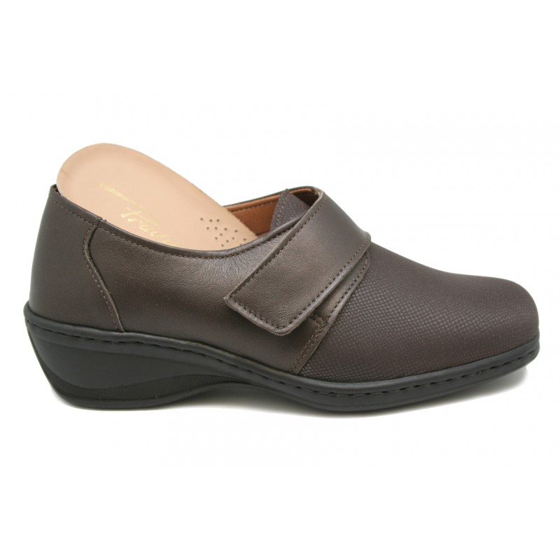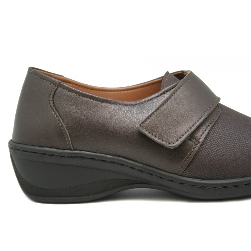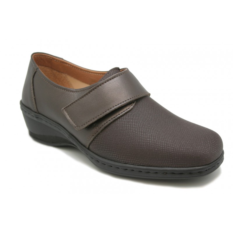 Zapato mercedes, con velcro ajustable al empeine y pala totalmente lisa en una suave lycra marrón adaptable a las dificultades del pie. Trasera en piel perlada marrón oscuro. Plantilla extraíble