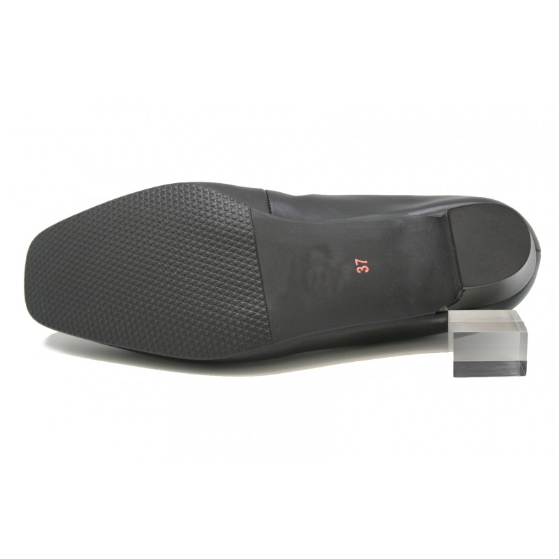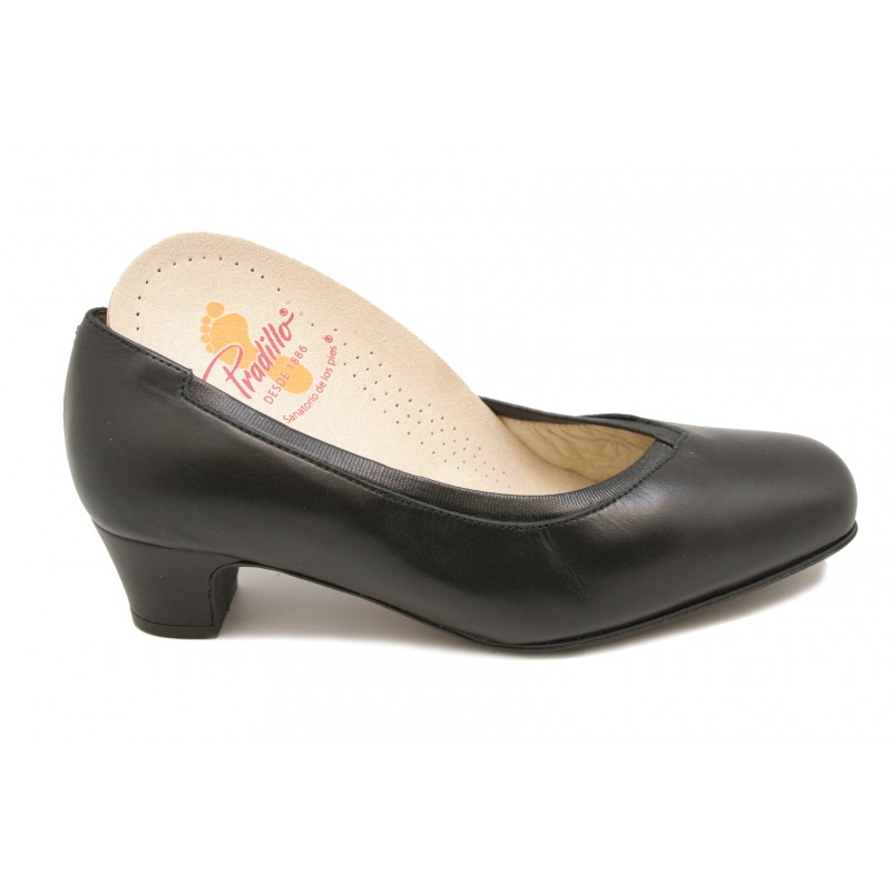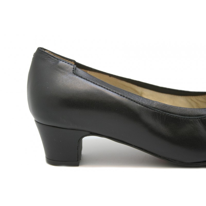 Clásico salón con escote en pico fabricado en una suave piel de becerro negro. Rock and roll en hueco para el perfecto ajuste del zapato al pie. Plantilla ortopédica extraíble incluida en el precio. Muy cómodo. Para vestir.
