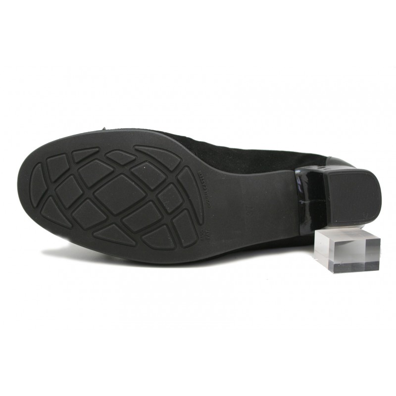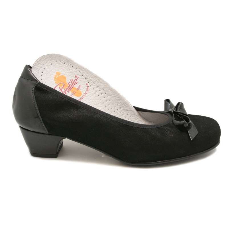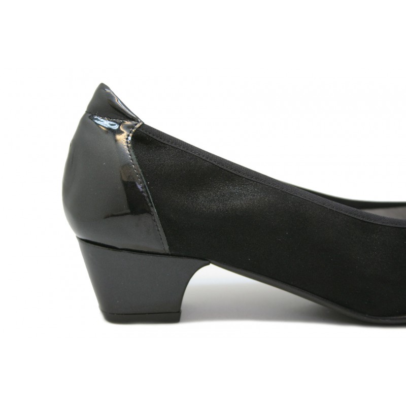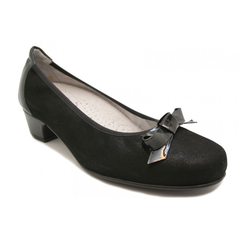 Salón con escote redondo y plantilla ortopédica extraíble incluida en el precio. Fabricado en ante nacarado negro con lazo trasera y tacón en charol negro. Elástico en hueco para el mejor ajuste del pie. Elegante y cómodo a la vez. Posibilidad de acoplar la plantilla ortopédica del cliente.