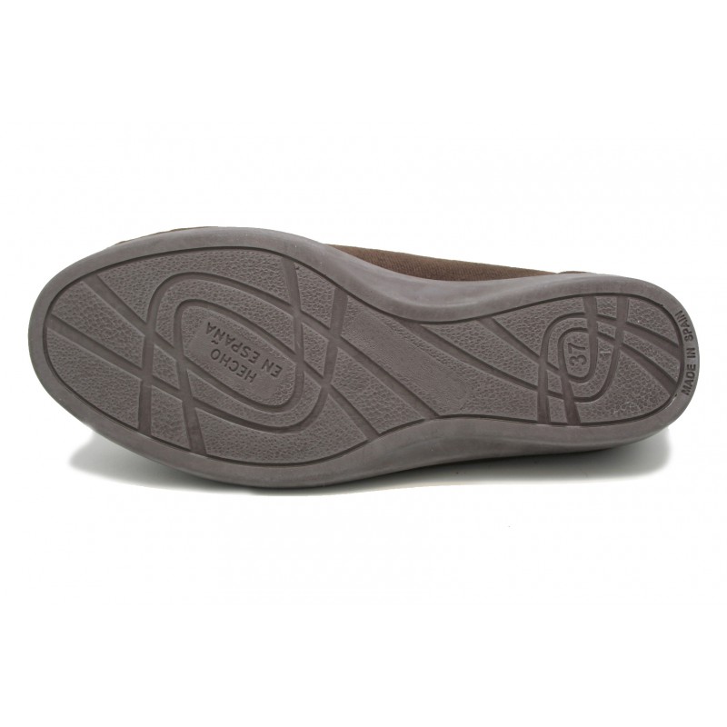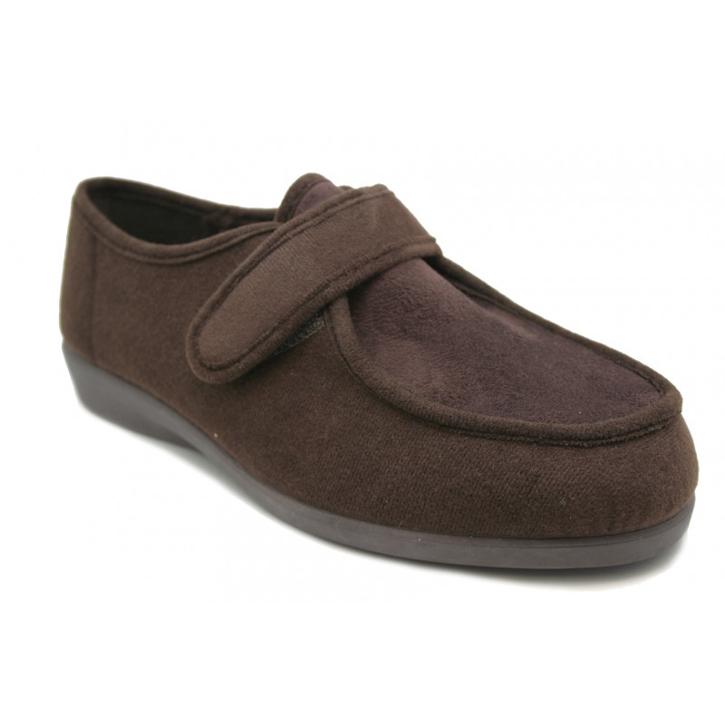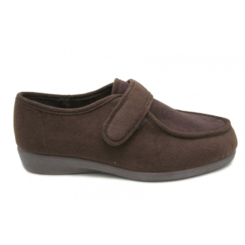 Zapatilla con velcro, super ancha, en lycra y suante marrón, especial para pies delicados . Cuña descanso. Especial para todos los pies, por muy dificiles que sean.