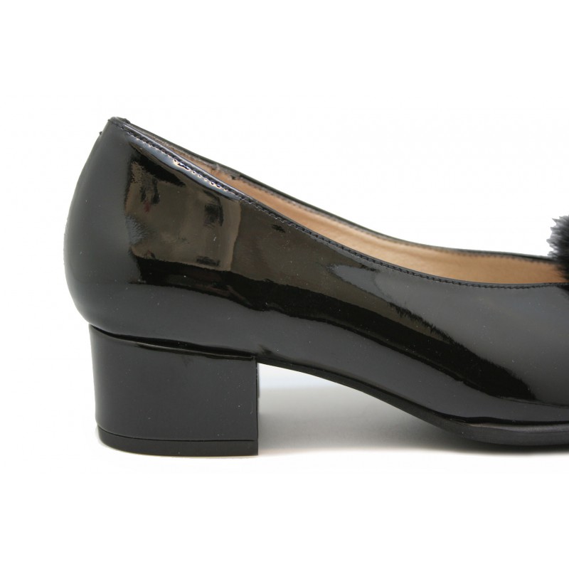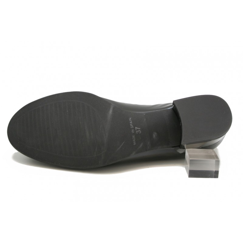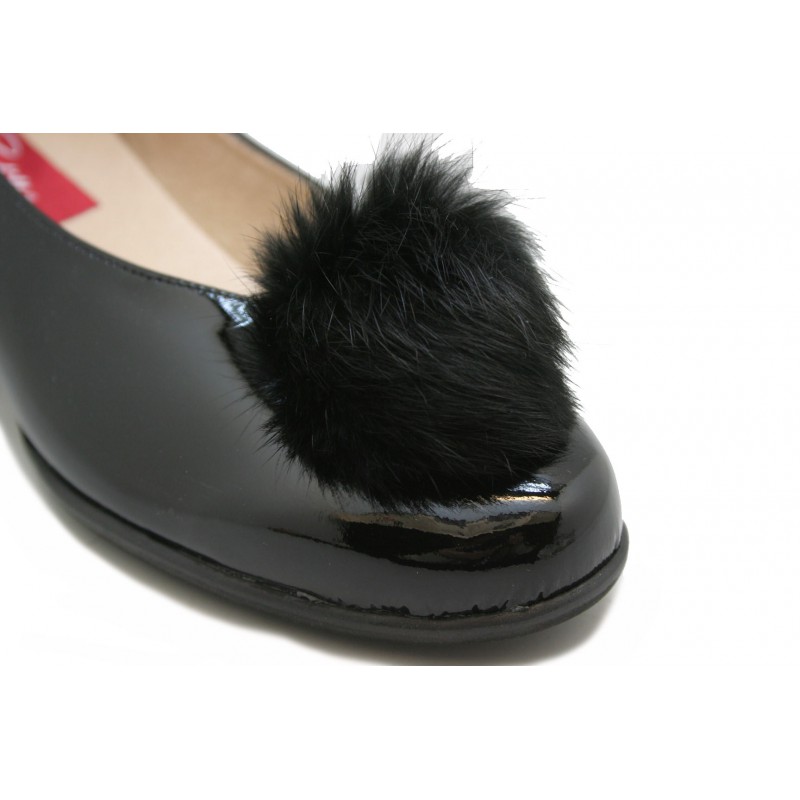 Elegante zapato de mujer para ir vestida y cómoda a la vez. Plantilla ortopédica incorporada y extraíble, posibilidad de acoplar la del cliente. Fabricado todo en una suave piel de charol negro. Con original adorno en escote. Tacón muy cómodo y horma descanso.