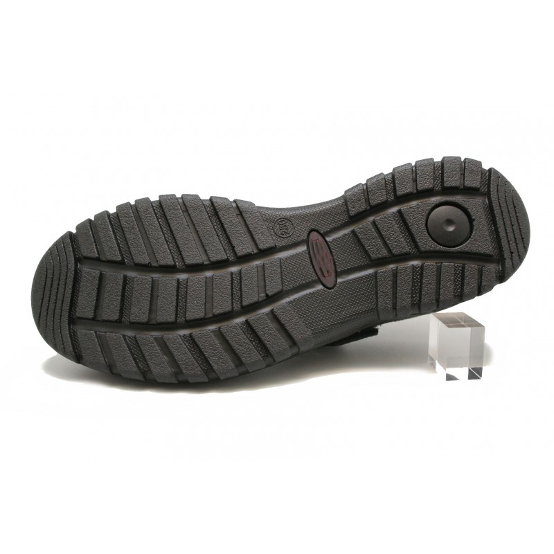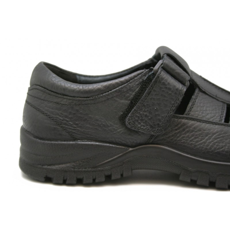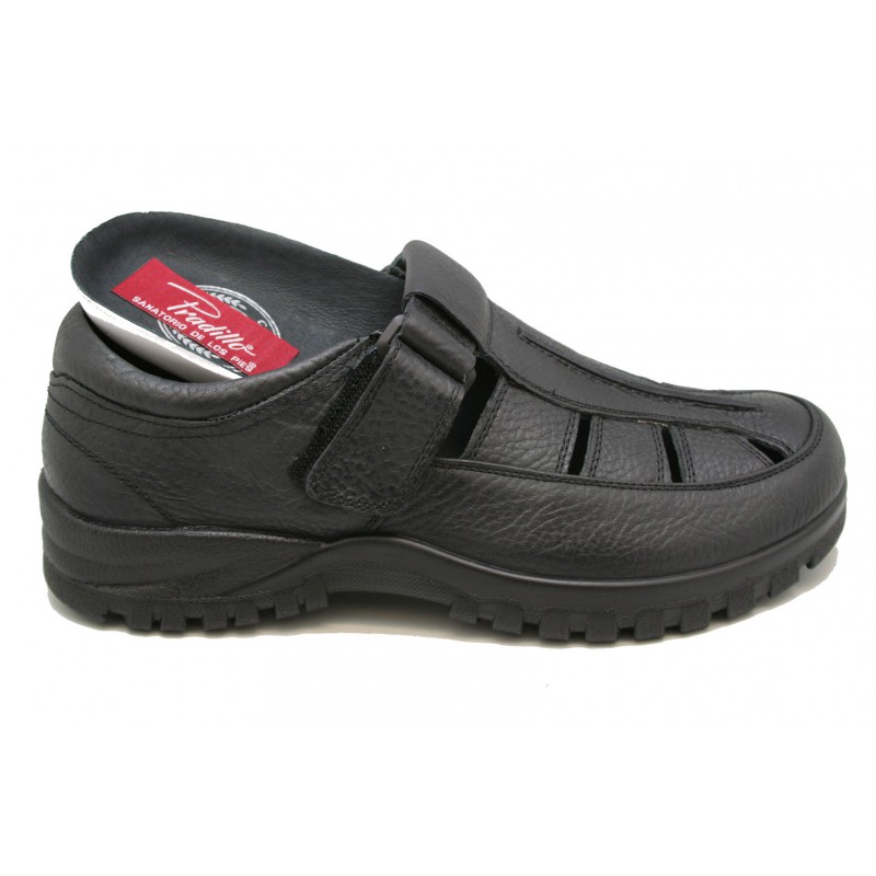 Ancha y cómoda sandalia para hombre con velcro al empeine y plantilla ortopédica extraíble. Fabricada en una suave piel negra. Pespuntes beiges. Forro de piel marrón y piso de goma muy flexible. Originales calados para que ventile el pie en verano.