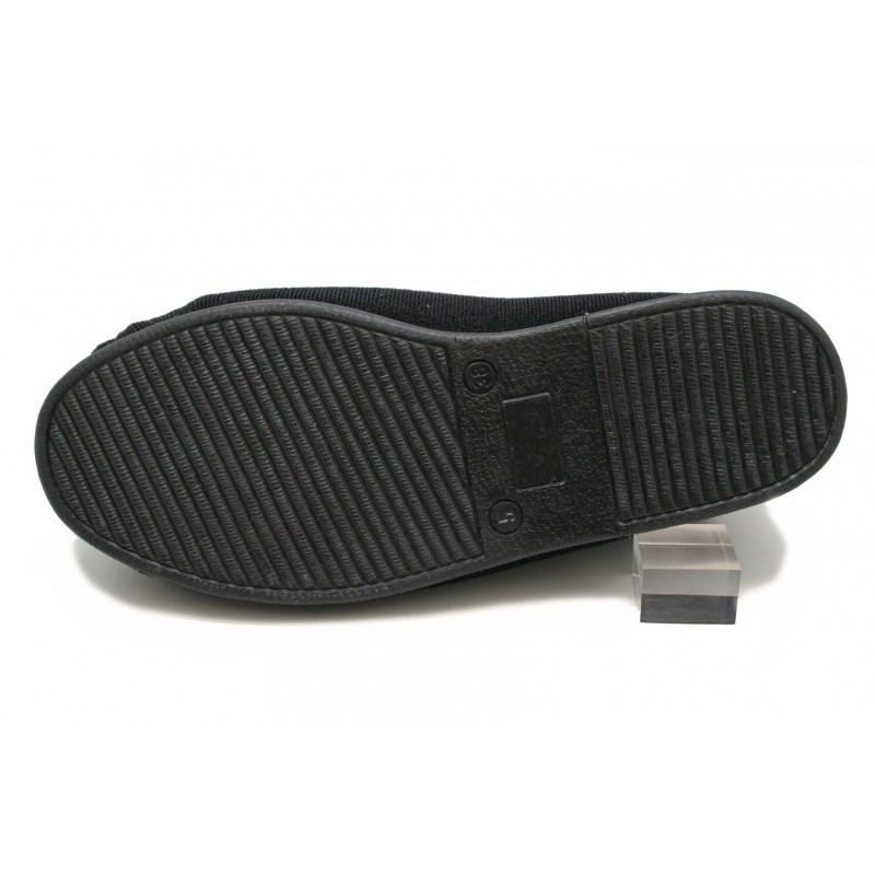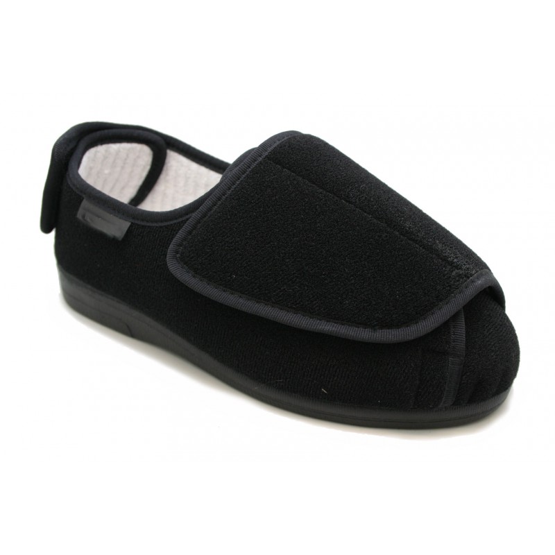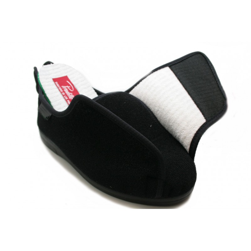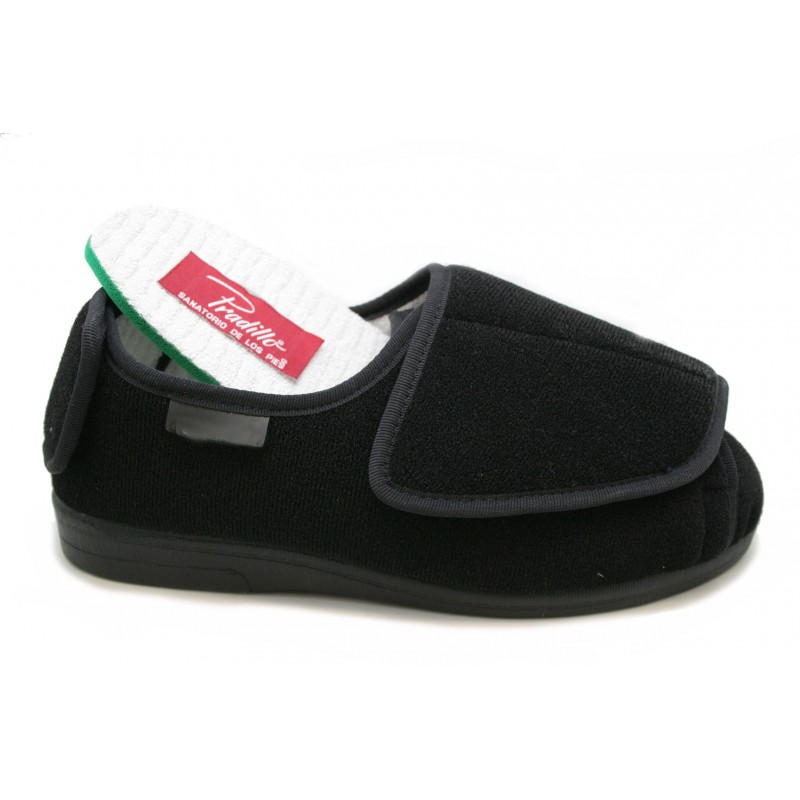 Zapatilla con pala tipo sobre y velcros ajustables en empeine y trasera. Fabricada toda en terciopelo negro. Forro coolmax (máximo frescor). Protegida con materiales anti-alérgicos. Zapatilla especialmente diseñada para pies con problemas y post-operatorio. Calzado geriátrico sanitario.