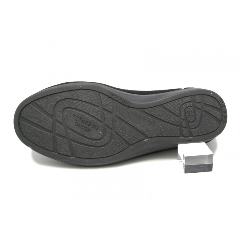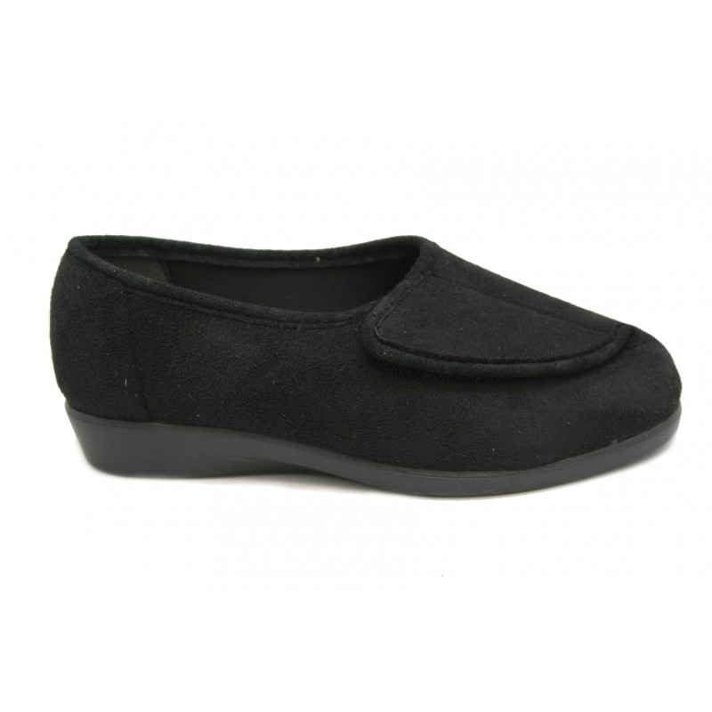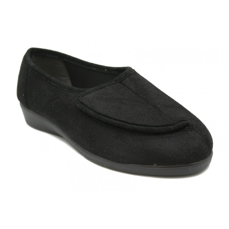 Zapatilla, muy especial, en lycra negra y ancho 16. Tiene una solapa en el empeine con velcro que se adapta a cualquier tipo de pie con dificultades extra anchas. Muy confortable para el invierno.