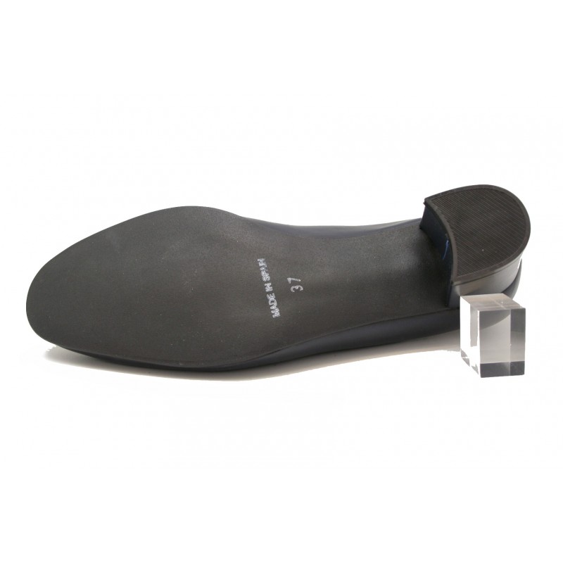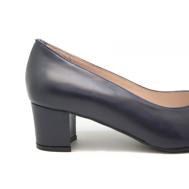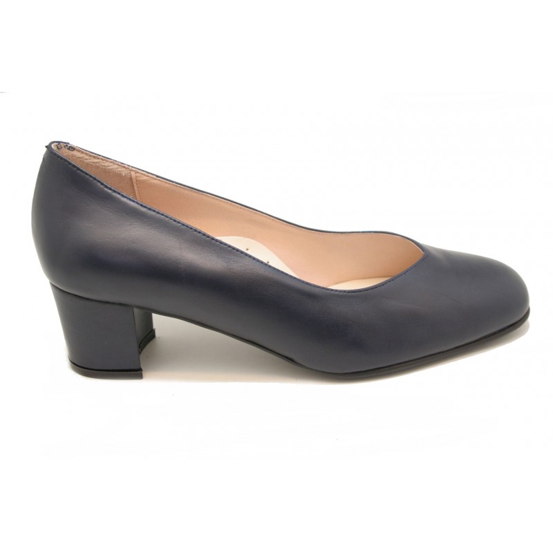 Magnífico zapato fabricado en una suave piel de tafilete azul, para mujer. Modelo salón clásico con escote en pico y planta anatómica. Tacón grueso muy ancho y cómodo de 4,5cm. de altura. Ideal para eventos en esta primavera.