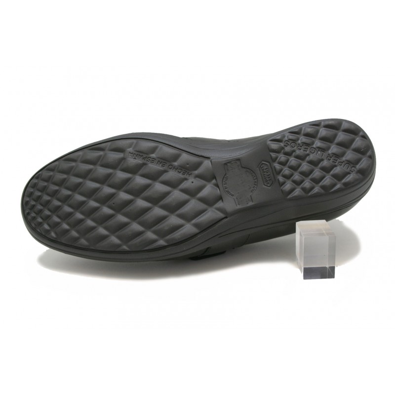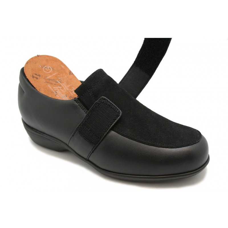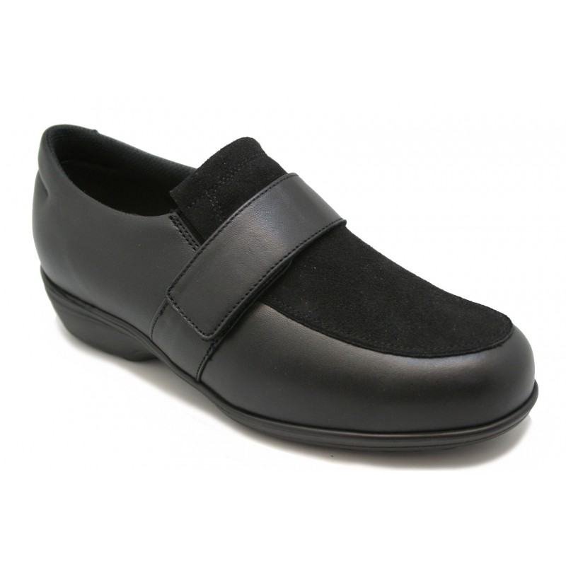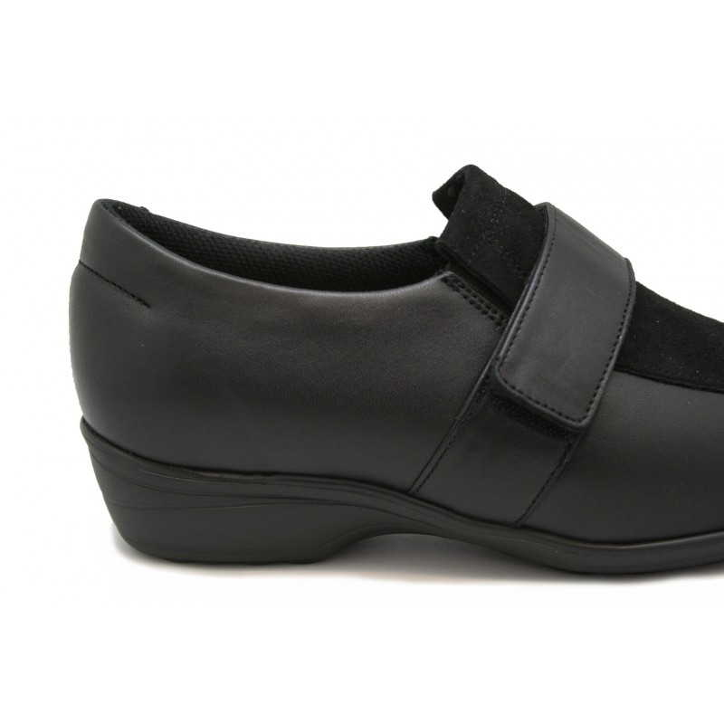 Único zapato mocasín de mujer, diseñado para acoplar plantilla ortopédica. Fabricado en piel negra con el mocasín en ante al tono. El zapato esta provisto de dos elásticos para facilitar la entrada del pie y además una tira velcro que abraza el empeine. También dispone de una plantilla extraíble de viscolatex de 5mm de espesor. Zapato para mujer con los pies anchos y delicados.