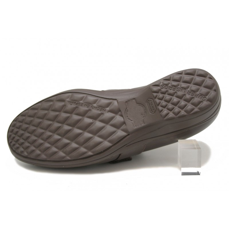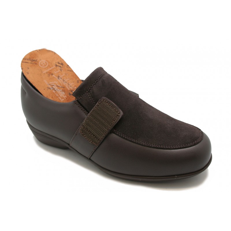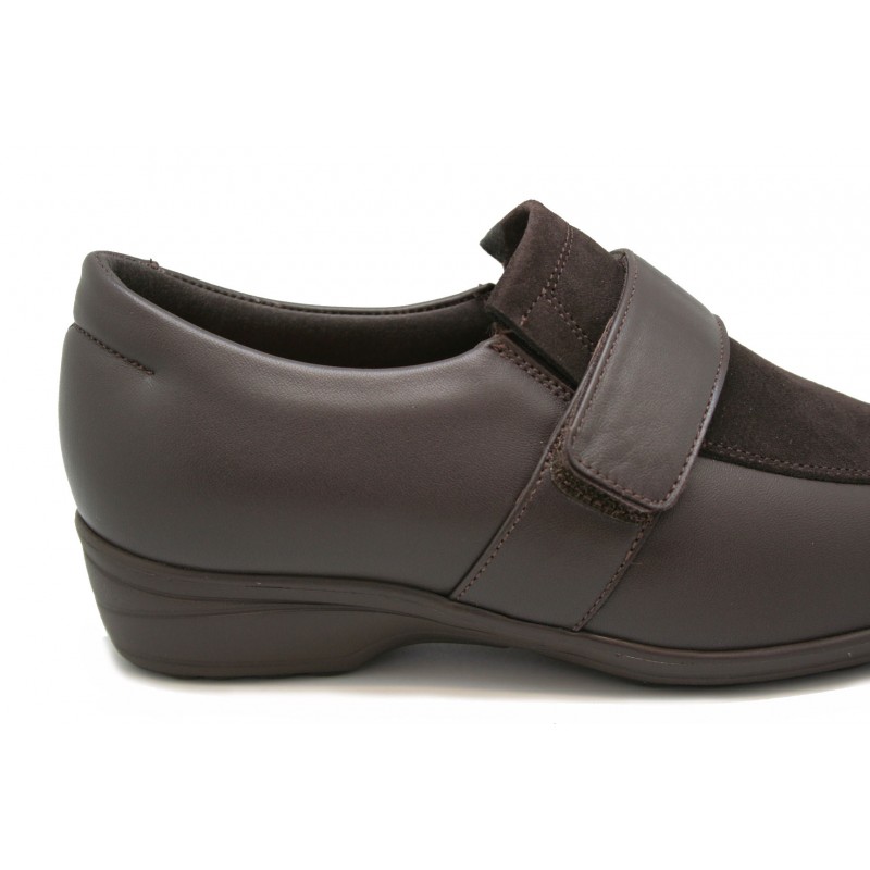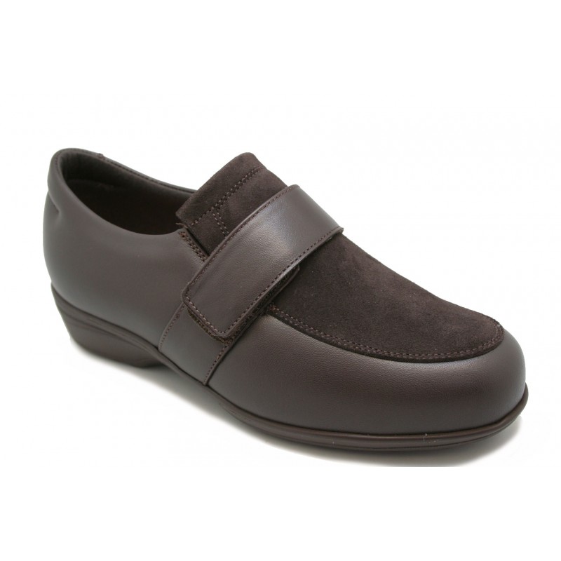 Zapato mocasín cómodo para mujer con posibilidad de acoplar plantilla ortopédica. Fabricado en una suave piel marrón con ante al tono. LLeva una tira con velcro ajustable al empeine para asegurar el pie y su confort. También lleva una plantilla termoconformada de viscolatex extraíble de 5mm. Zapato muy cómodo para caminar este otoño-invierno.