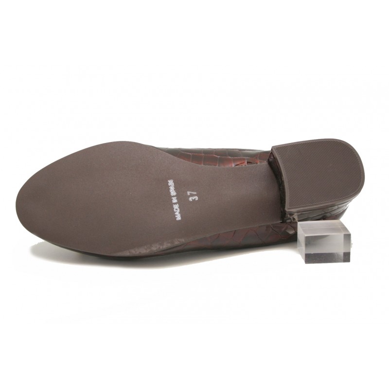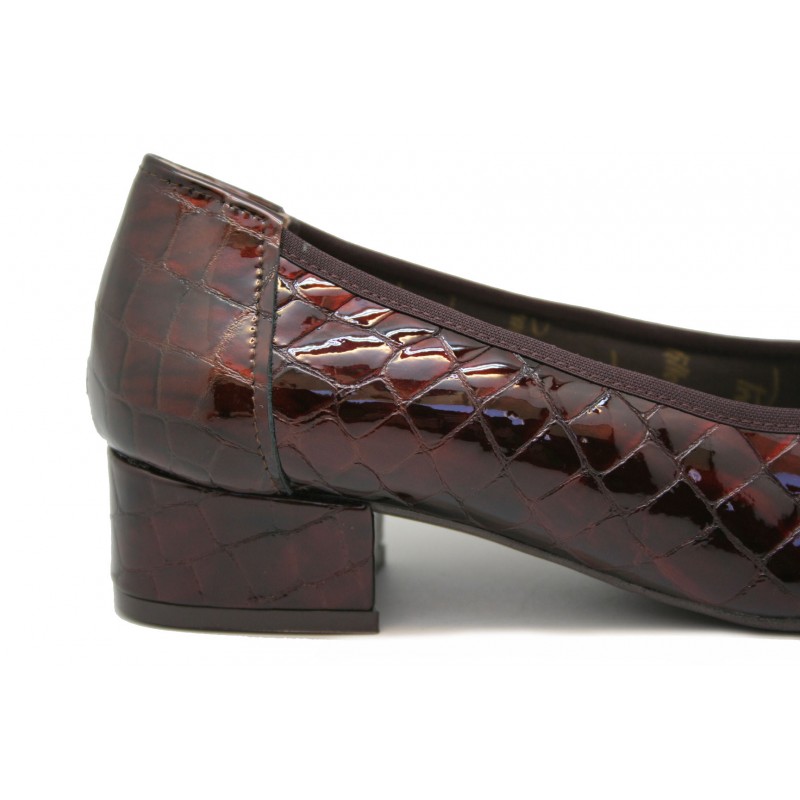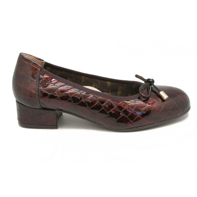 Comodísimo zapato con planta anatómica, fabricado en coco charol marrón. Rock and roll en hueco en textil. Lazo en escote con terminaciones metálicas. Forro confort Pradillo. Piso marrón al tono.