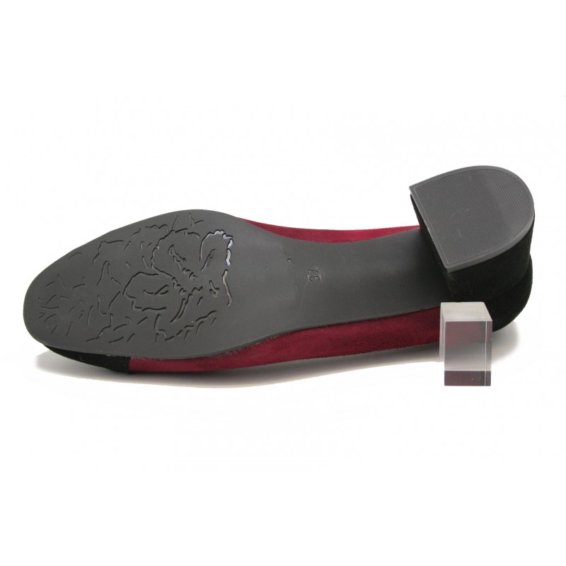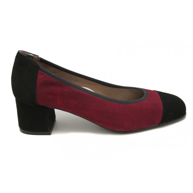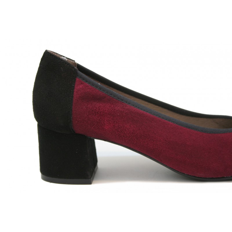 Zapato cómodo con planta anatómica fabricado en ante color burdeos con la puntera, trasera, tacón y ribete de boca en ante negro. Original, cómodo y muy vestido. La planta es anatómica tipo descanso y el tacón ancho con mucha base con forma pata de elefante. Joven y moderno además de cómodo.