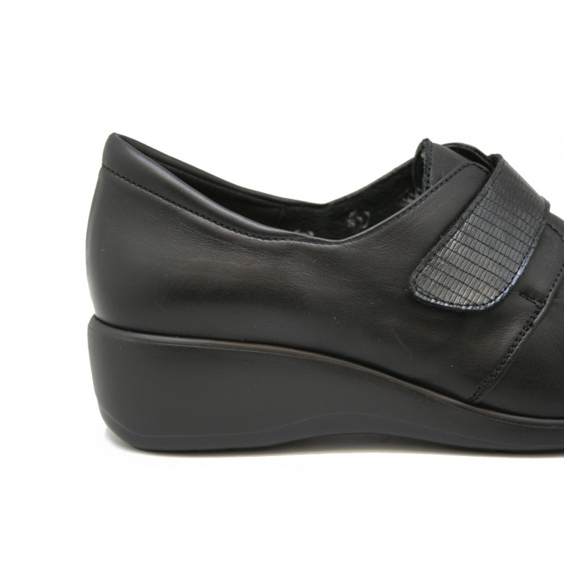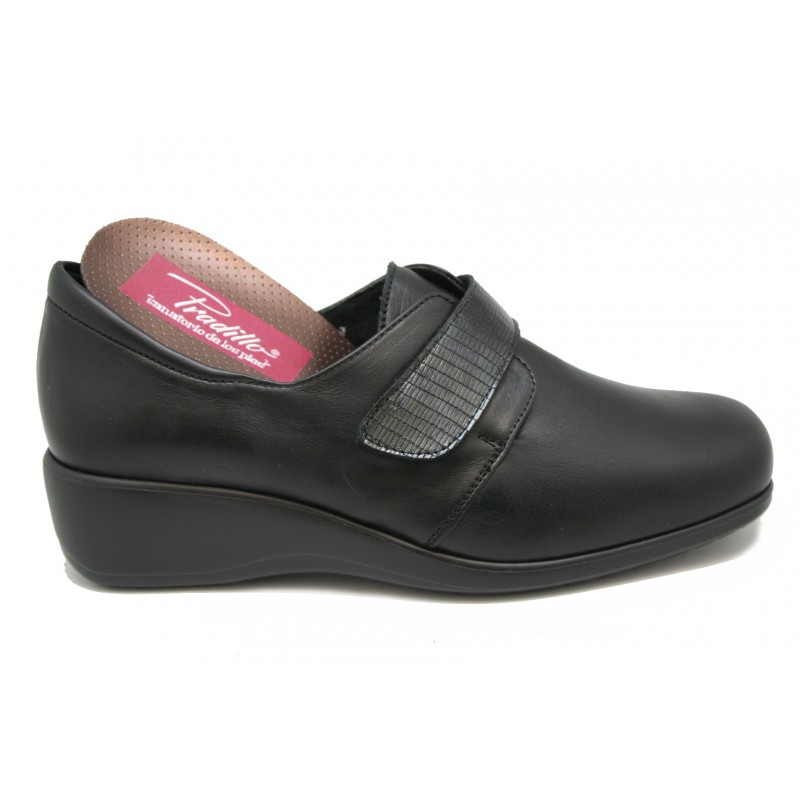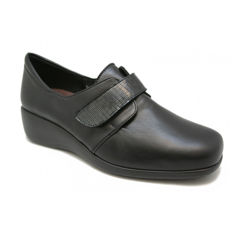 Zapato con la pala lisa sin costuras y con correa mercedes de gran sujeción al empeine. Frabricado en piel negra con lagarto metalizado al tono. Plantilla ortopédica incluida en el precio, extraíble e intercambiable por la del cliente. Al tener la pala lisa(sin costuras) es apropiado para pies con juanetes. Cuña descanso de 4,5cm.
