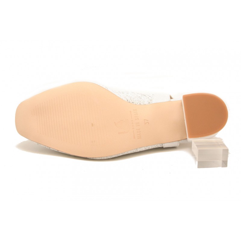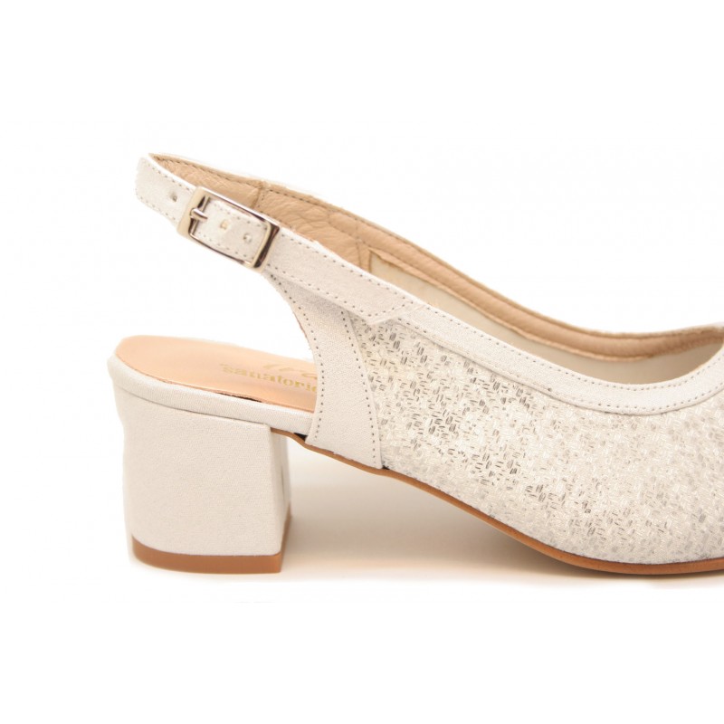 Zapato ancho y cómodo con talón abierto muy cómodo para la mujer de hoy. Este modelo sirve para vestir y caminar todo el dia. Está fabricado en una preciosa lycra con piel color plata. Tiene una hebilla en la trasera para ajustar a los diferentes tipos de pie. La lycra con la que está confeccionado este zapato se adapta al pie como un guante. Tacón descanso. Planta anatómica.