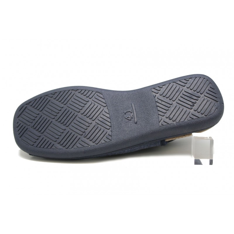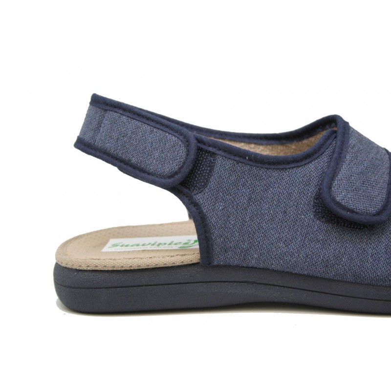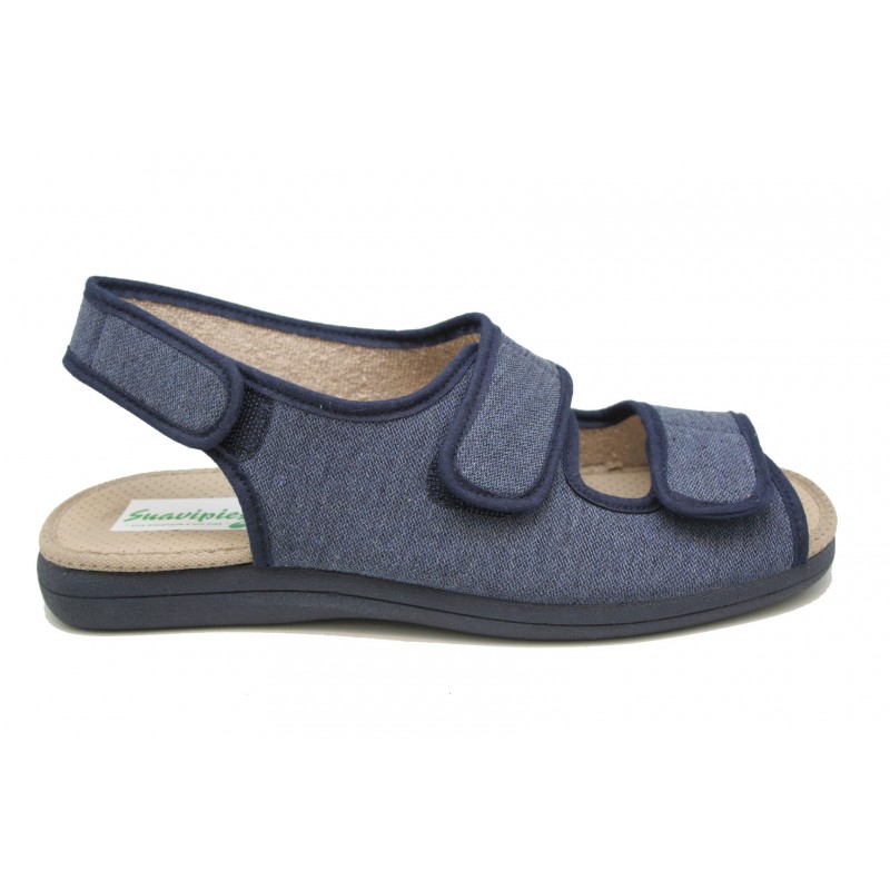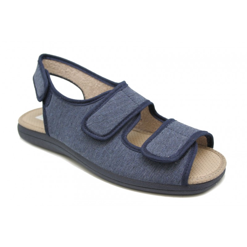 Sandalia para verano con tres velcros ajustables en empeine, dedos y trasera. Para pies anchos y delicados o con deformidades en los dedos. Fabricada en un tejido jaspeado azul marino. Vivos y piso al tono. Planta acolchada. Piso de goma antideslizante.