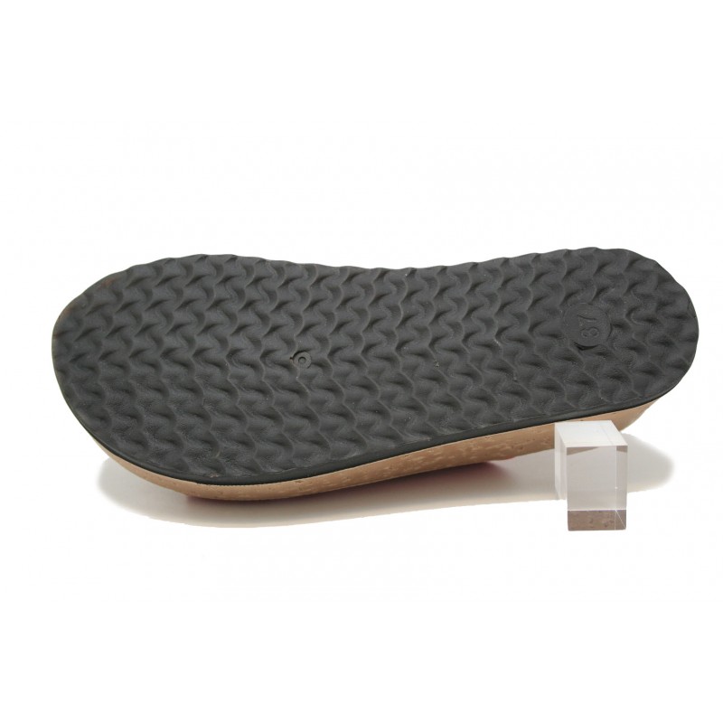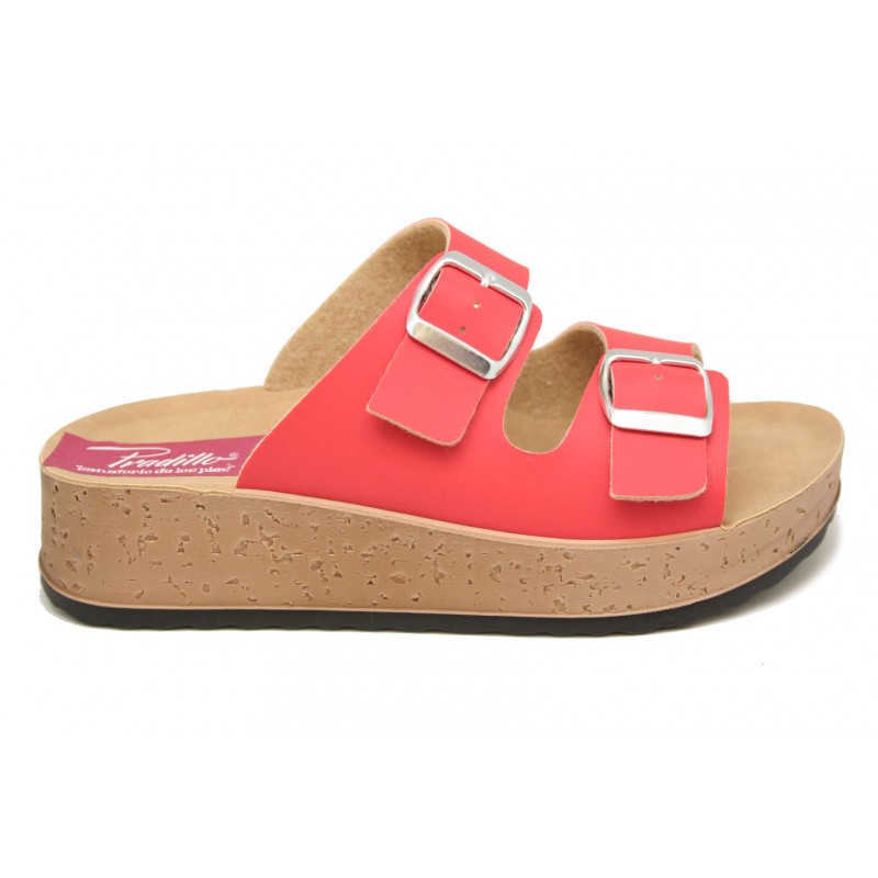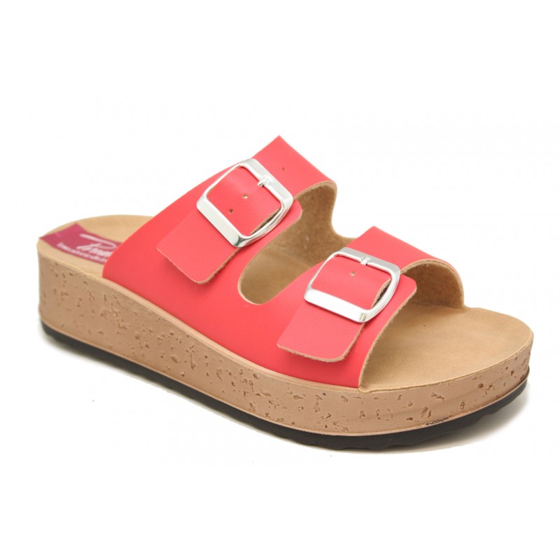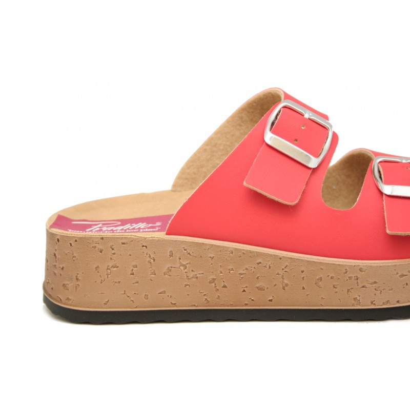 Joven y cómodo zueco con la planta mullida, fabricado en material reciclado ecológico color rojo. Plataforma de 2cm. de altura con el piso muy ligero.