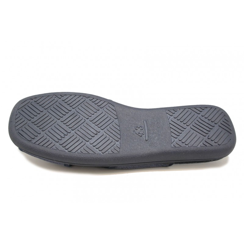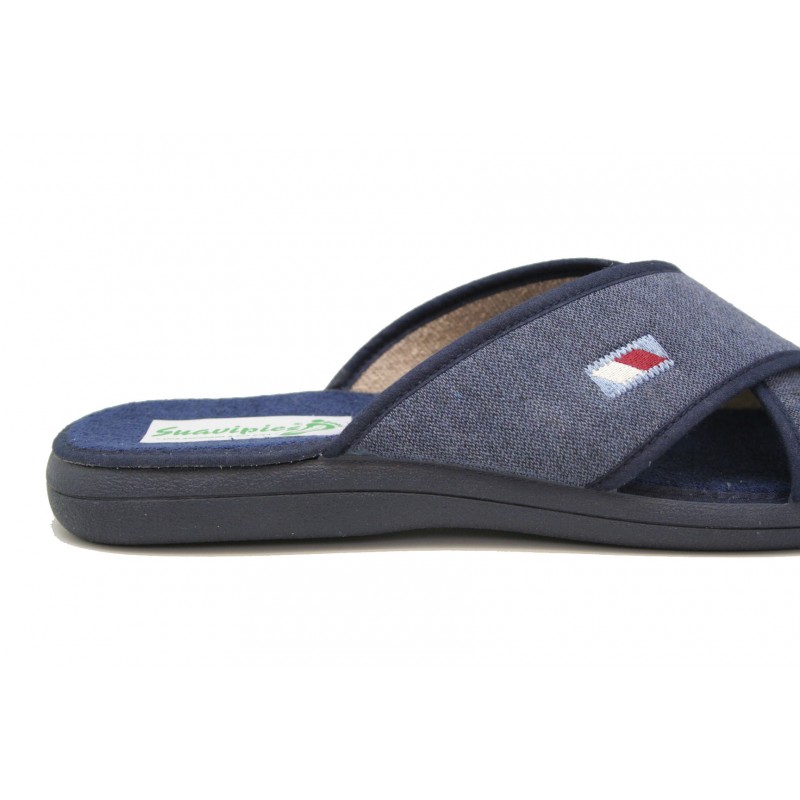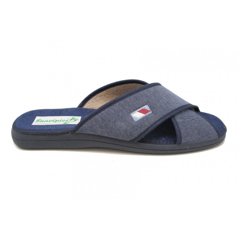 Chancla para hombre de baño, playa y piscina con dos tiras cruzadas fabricada en tejido marino. Los vivos y la planta van al tono. El piso es de goma muy flexíble y antideslizante. También muy cómoda para estar en casa.