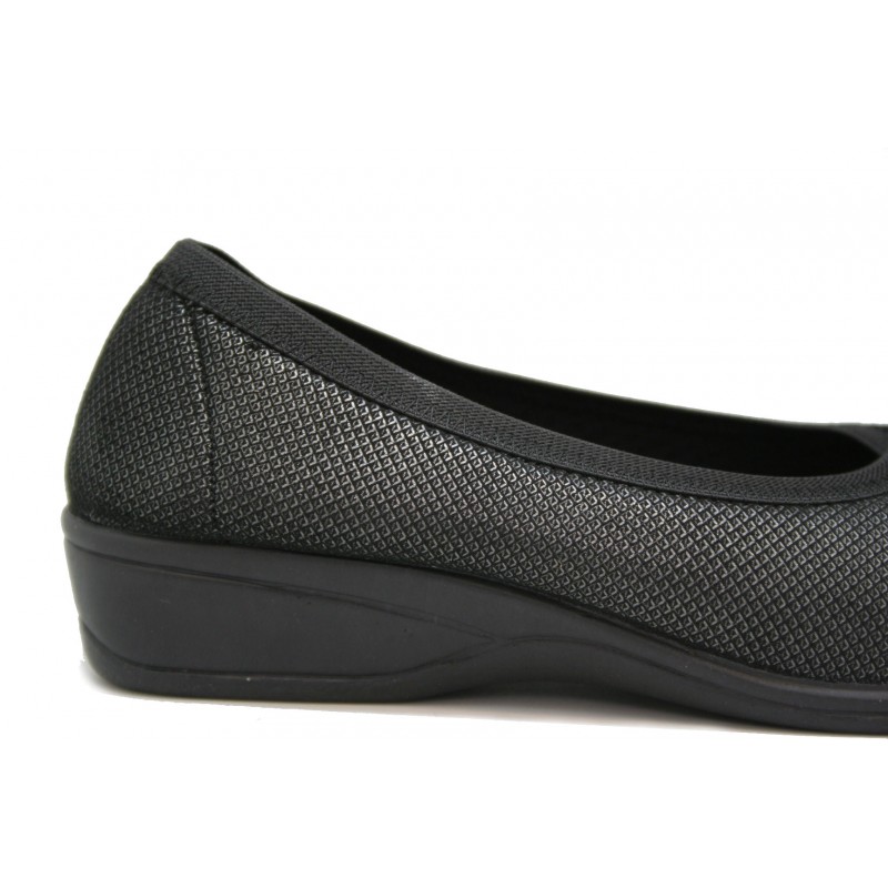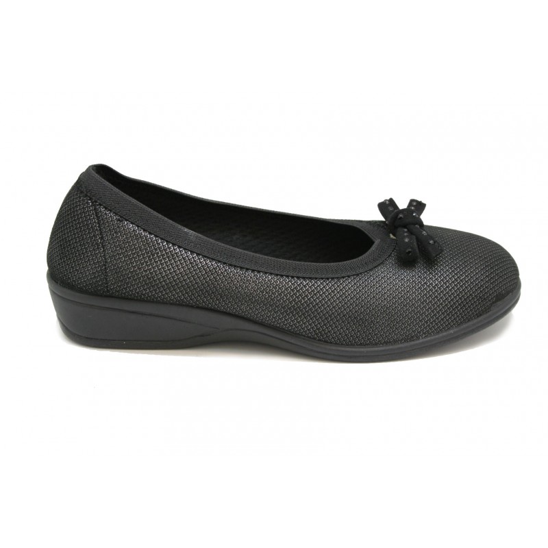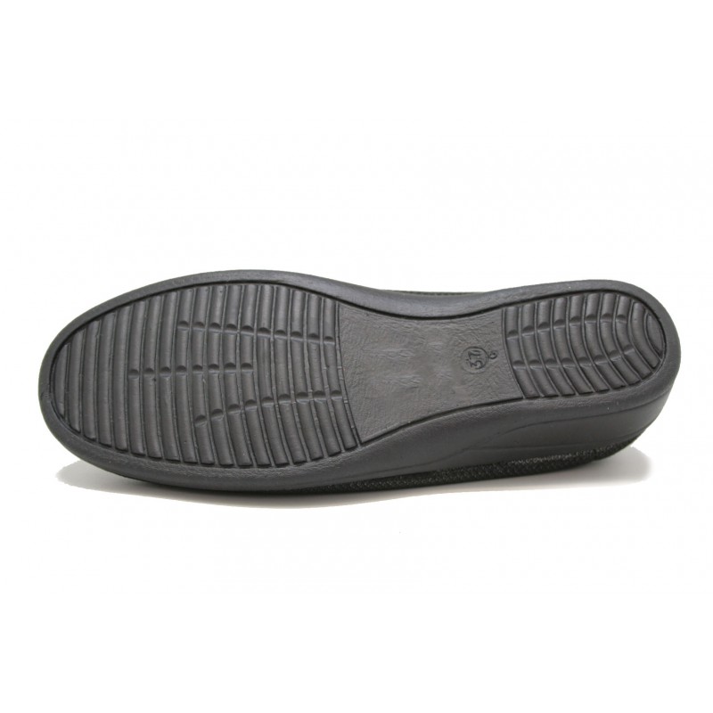 Salón tipo manoletina con goma en escote que recoje muy bien el pie. Fabricado todo en una lycra adaptable color plomo. Forro textil y gracioso lacito en ante negro con nudo y cristales. Piso de goma antideslizante. Sin costuras. Para pies delicados.