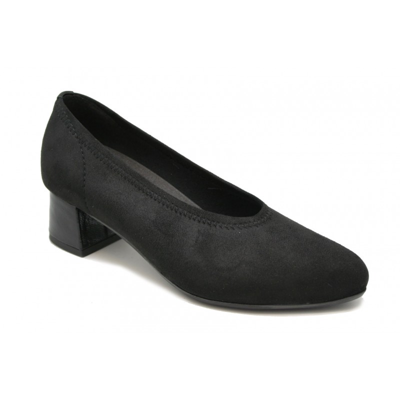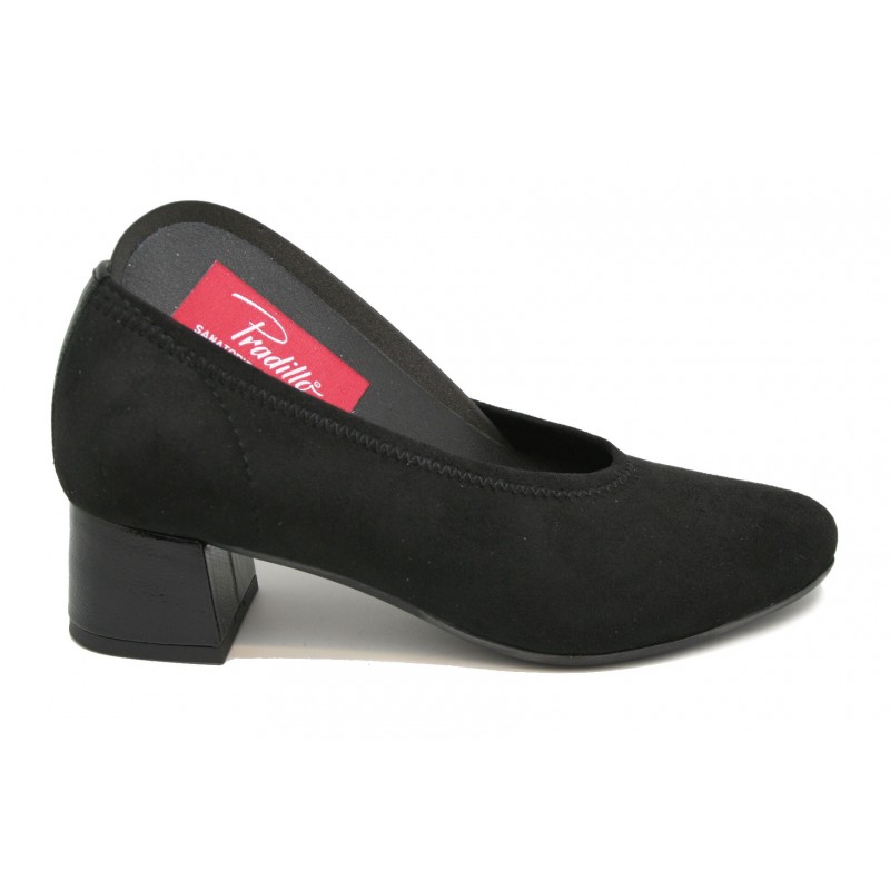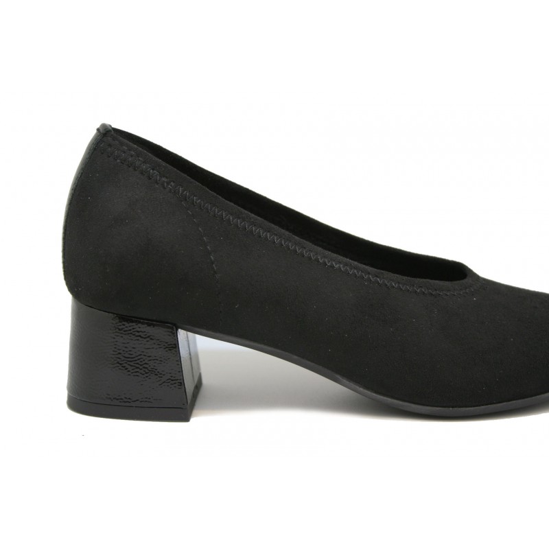 Zapato de mujer fabricado en lycra suede negra. Moderno, ancho y cómodo para vestir. Tacón de pata de elefante de 4,5cm de altura. La plantilla es extraíble e intercambiable por la del cliente. Piso goma anti-impactos. Forro lycra.