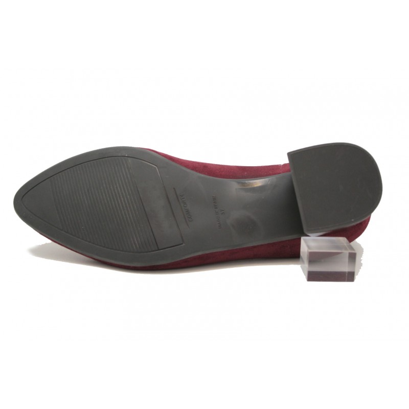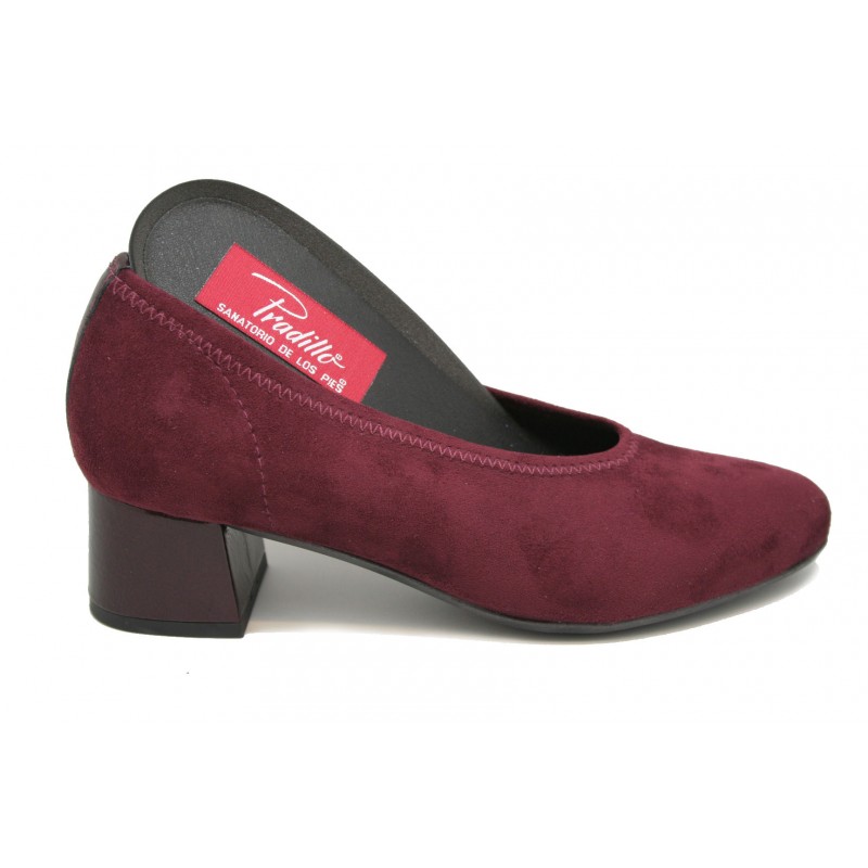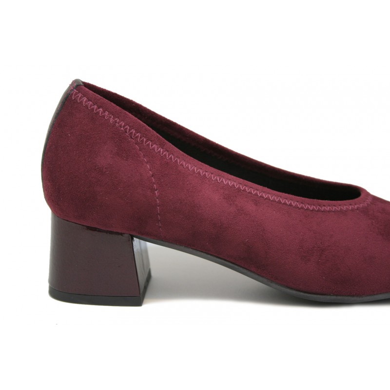 Salón de vestir fabricado en ante elástico color burdeos, adaptable a todos los pies. La plantilla está incluida en el precio y es intercambiable por la del cliente. Tacón moderno de gran base que favorece la estabilidad al caminar. Ideal para ir vestida y cómoda a la vez.