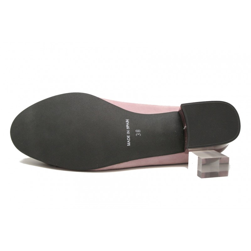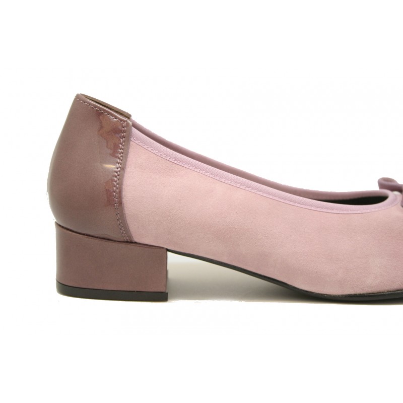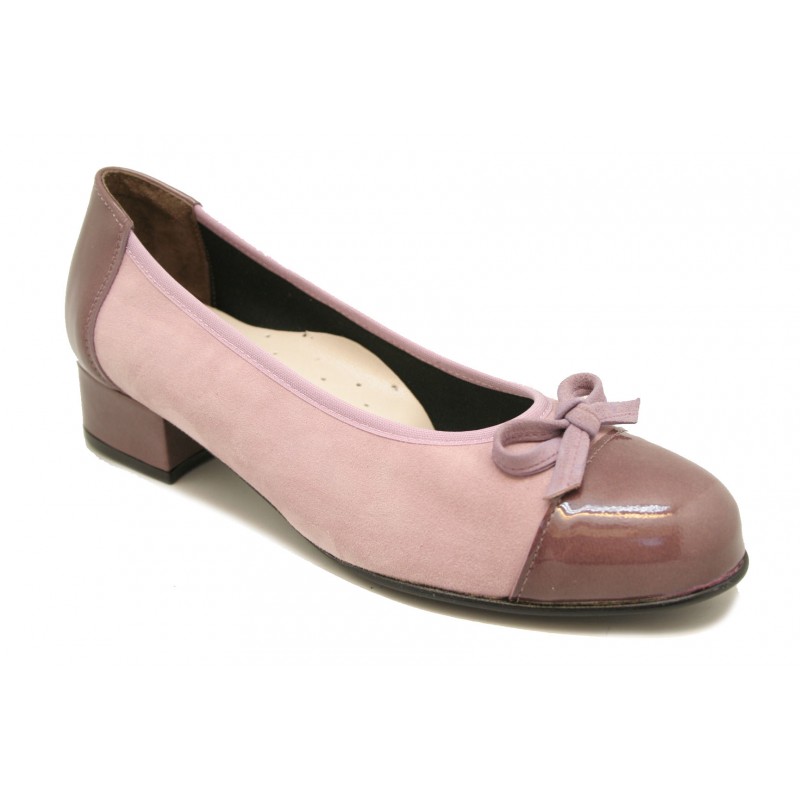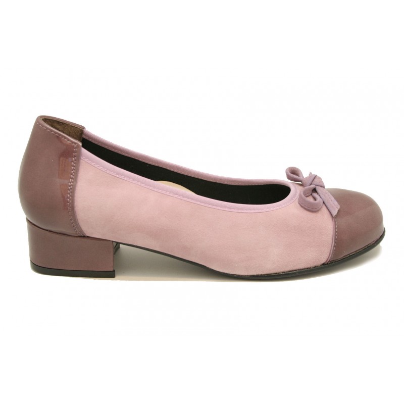 Cómodo zapato con la planta anatómica, fabricado en un suave afelpado color lila. La puntera, trasera y tacón van al tono en charol. Elegante lacito con nudo en ante. La planta es anatómica forrada de piel. Adaptable para los pies más delicados. Forro foam. Rock and roll textil al tono.