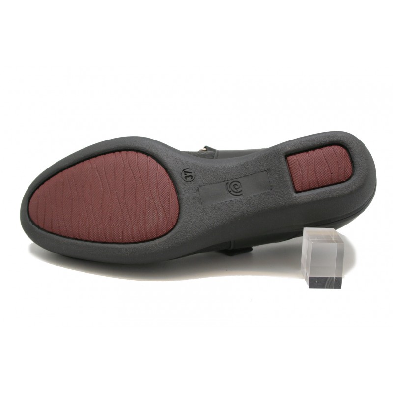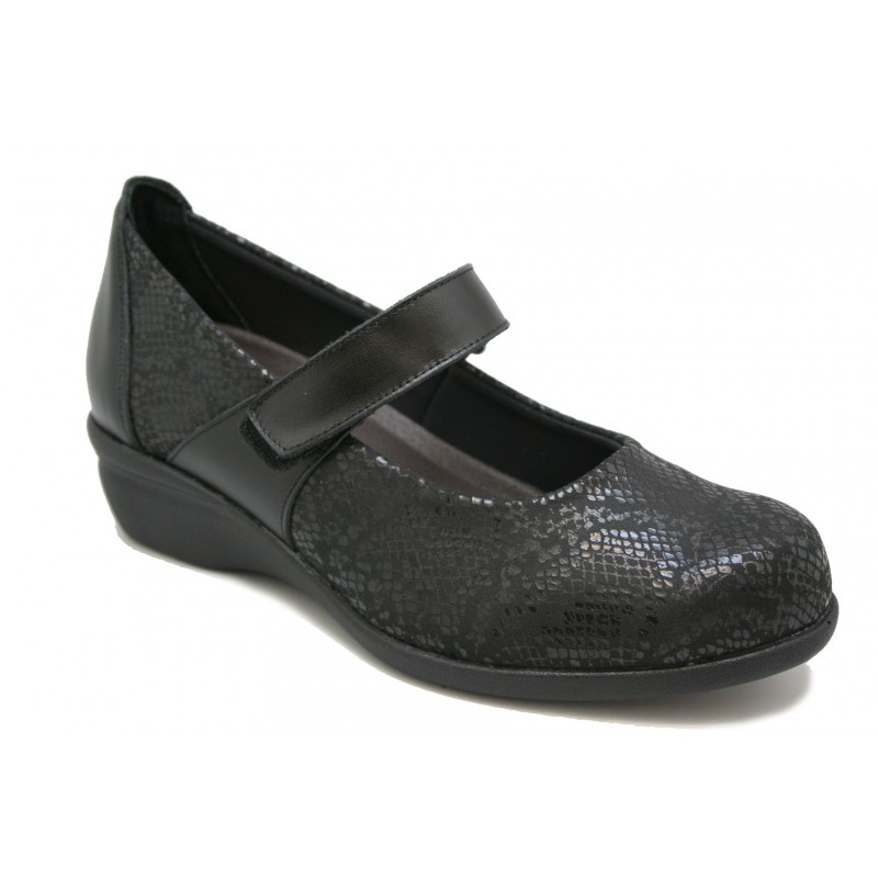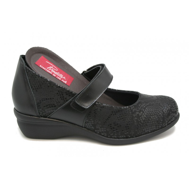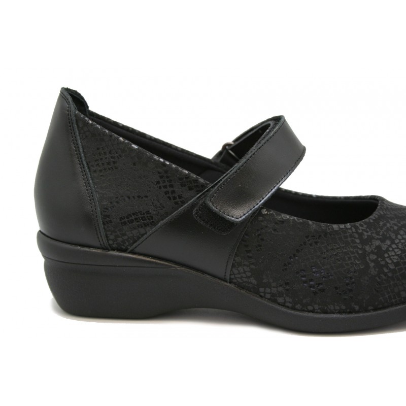Comodísimo zapato para mujer con tira mercedes al empeine, fabricado en lycra imitación serpiente negra con piel al tono. Especialmente diseñado para acoplar plantilla ortopédica que es intercambiable y extraíble, además de estar incluida en el precio. La parte delantera va forrada en lycra negra para que se adapte a los juanetesn callos, dedos en garra, etc.... La trasera va forrada en piel. La cuña es tipo descanso de 3,5 cm. de altura y el piso anti-impactos. La tira mercedes se adapta con velcro y es ajustable