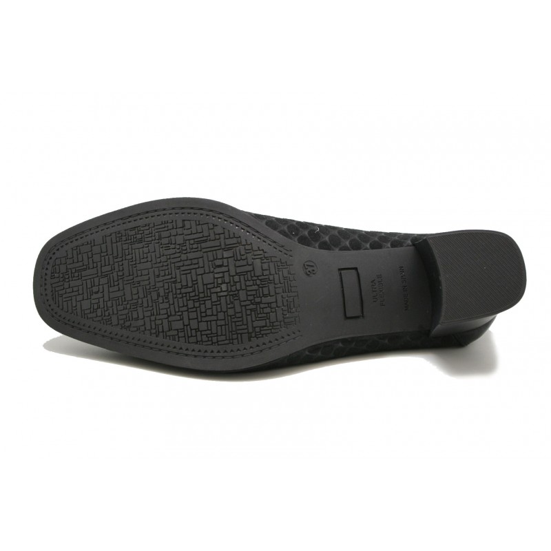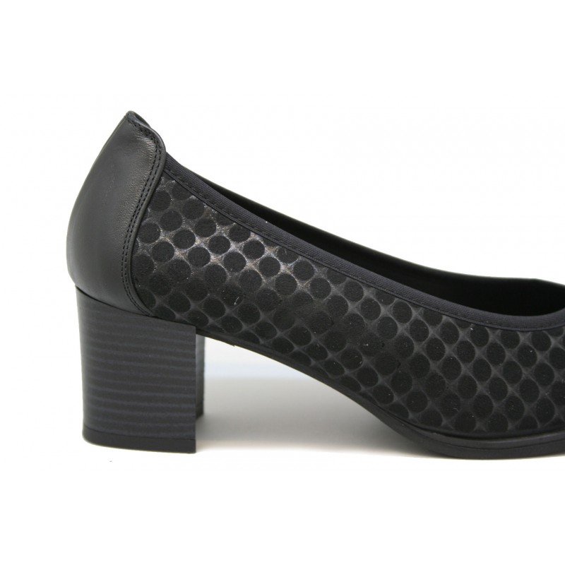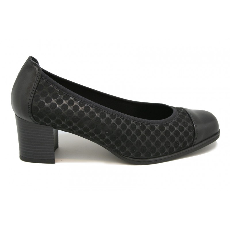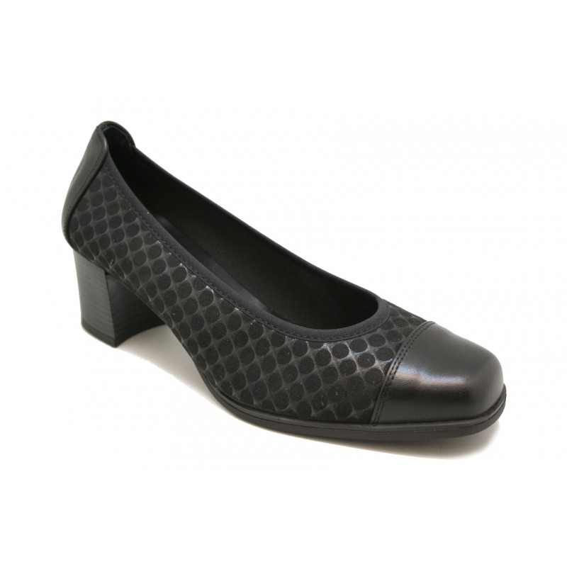 Zapato de mujer con planta anatómica fabricado en lycra negra y piel al tono. Zapato para ir cómoda y a la vez vestida. Tacón cubano muy ancho y de gran base. El piso es de goma grueso para evitar el daño del pavimento en el pie. Goma elástica en el escote para que el zapato no se desboque.