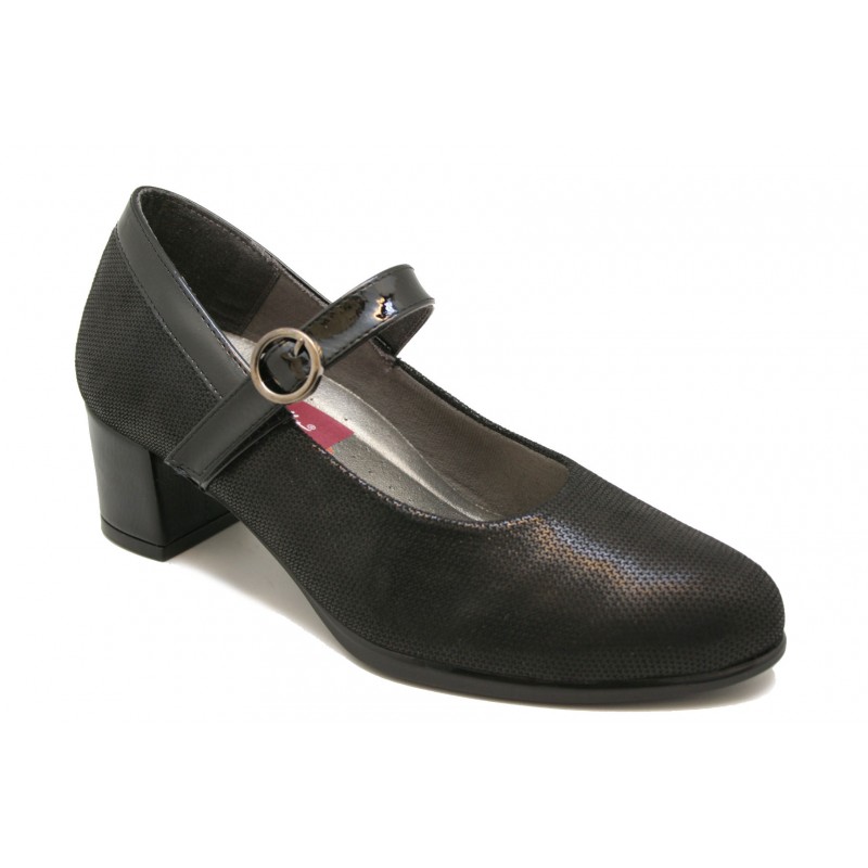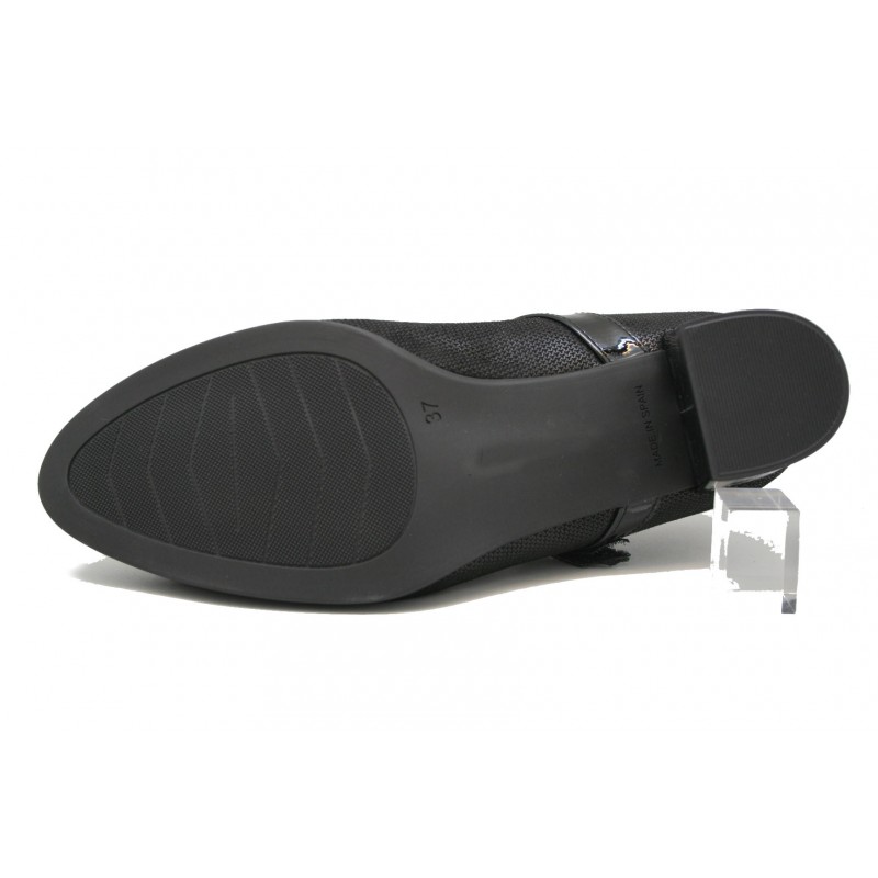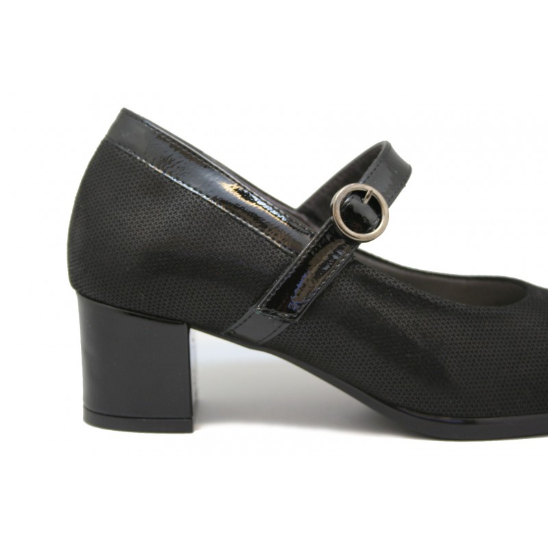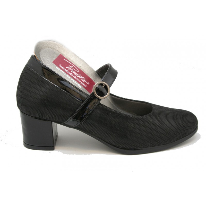 Zapato de mujer para poder ir vestida y acoplar su plantilla ortopédica. Está fabricado todo en lycra metalizada negra con la tira mercedes, la talonera y el tacón en charol negro. La plantilla ortopédica va incluida en el precio y además es extraíble y se puede cambiar por la del cliente. El tacón tiene base a pesar de su altura(4,5cm.).