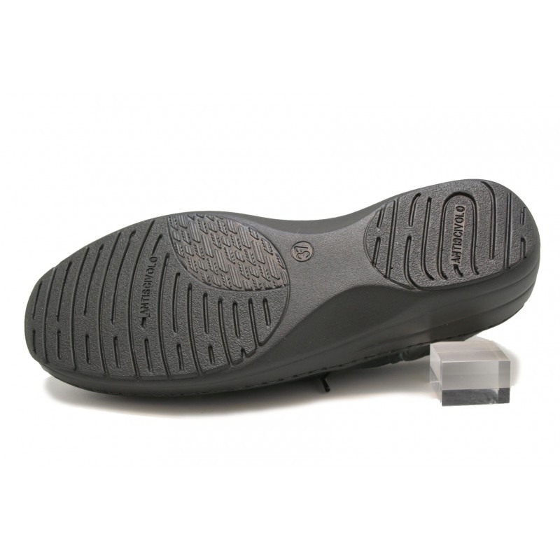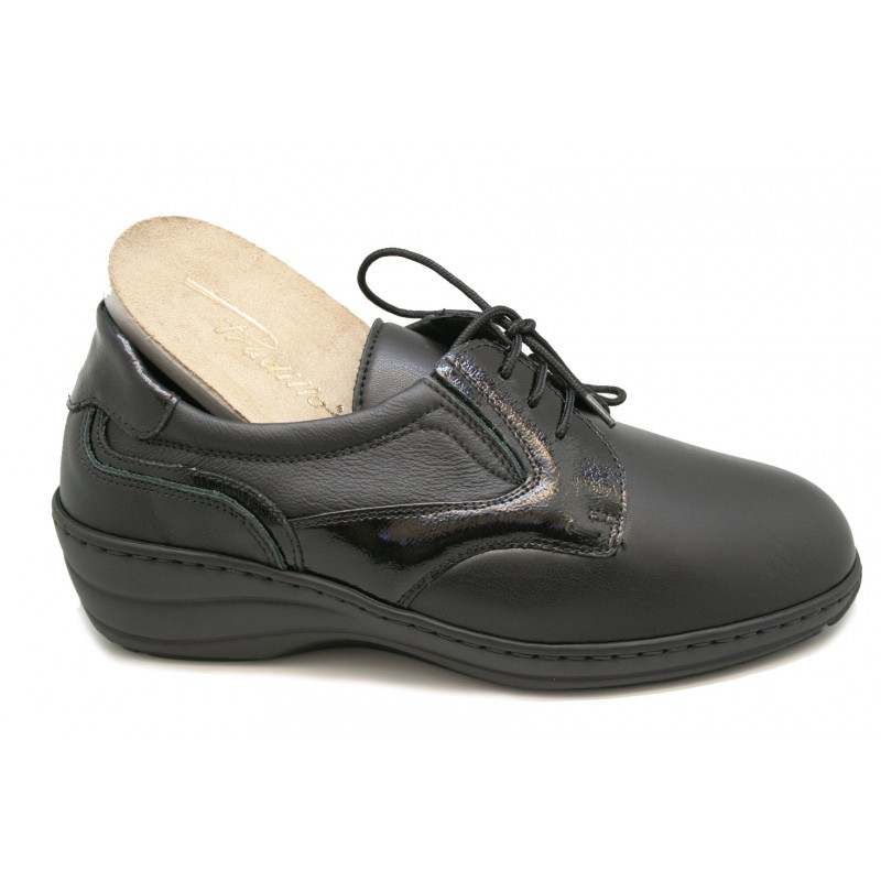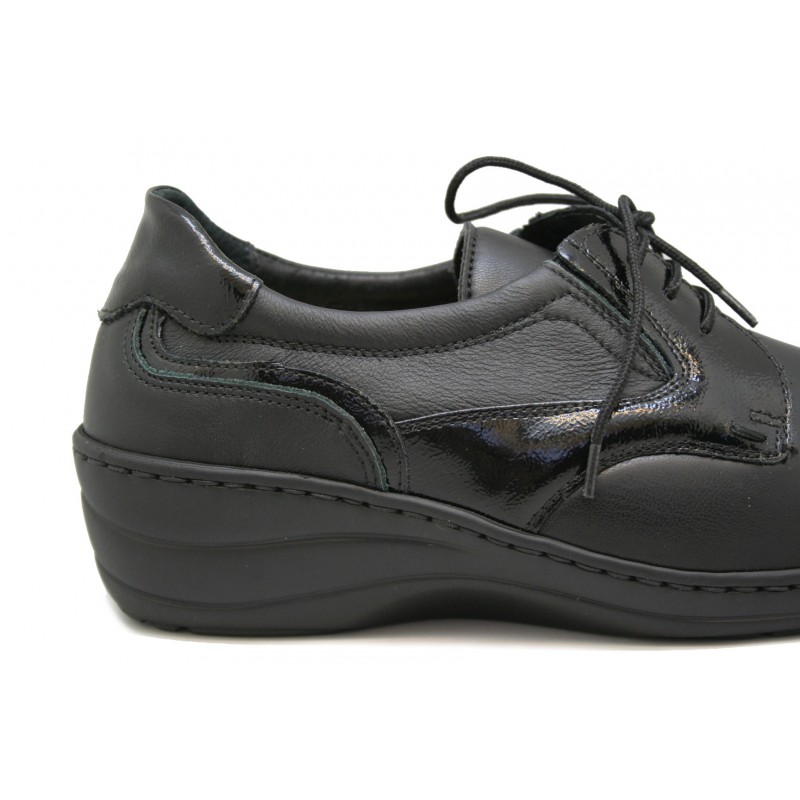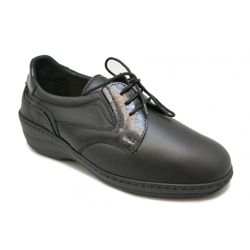 Zapato con cordones ajustables al empeine, diseñado para acoplar plantilla ortopédica. La pala está fabricada en nappa elástica adaptable a todos los pies con dificultades. La trasera es de piel. La carrillera y el acolchado de boca va en charol negro. La plantilla es extraíble e intercambiable.