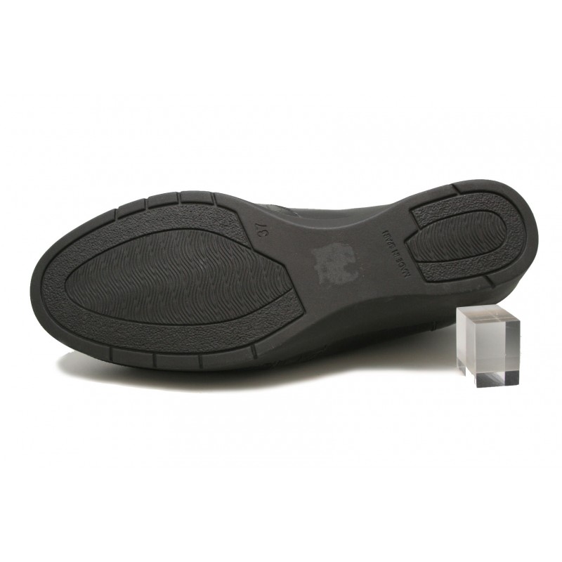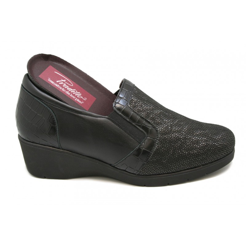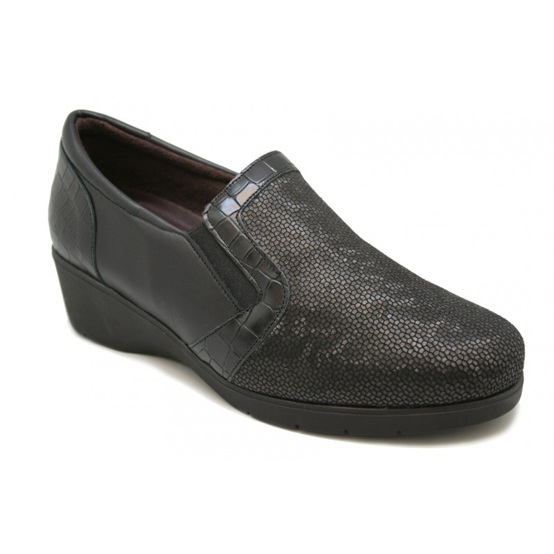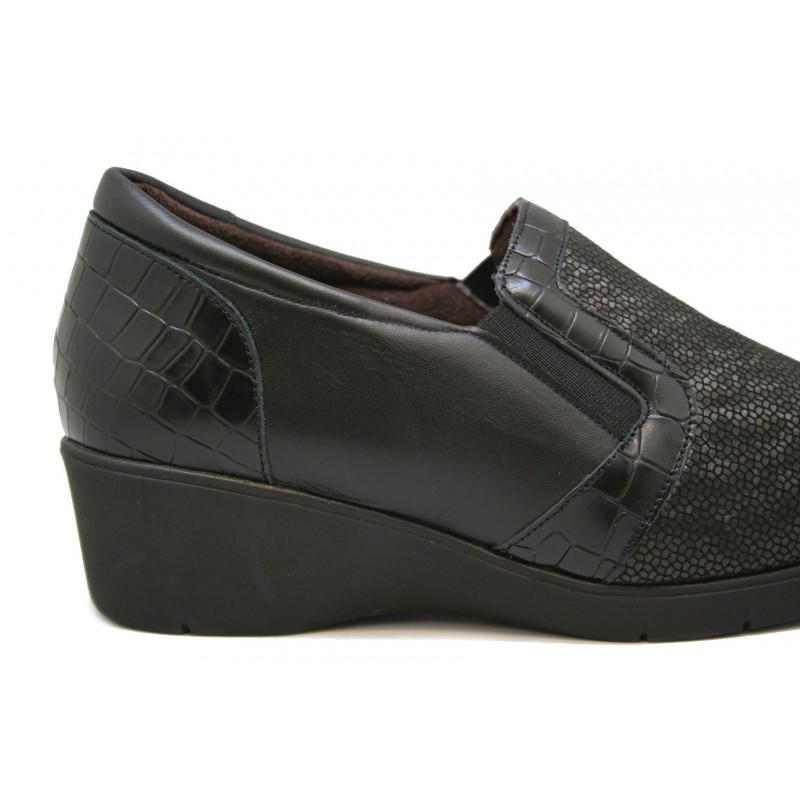 Mocasín con la pala en lycra, adaptable para los pies más delicados. Costados en una suave nappa negra y la boca del mocasín con la trasera en coco al tono. Plantilla extraíble e intercambiable por la del cliente. Forro textil marrón. Piso poliuretano con con semicuña descanso.