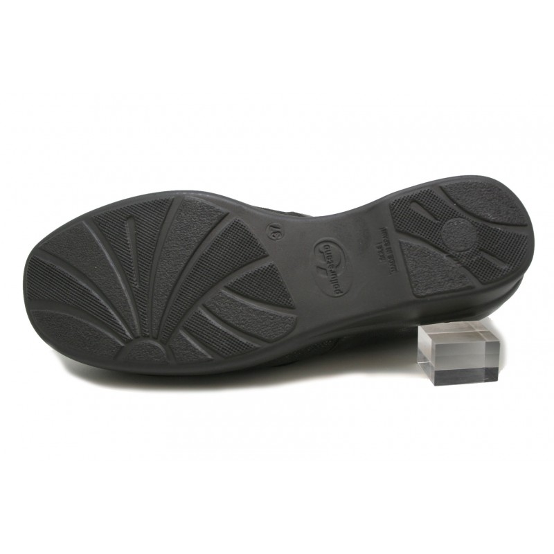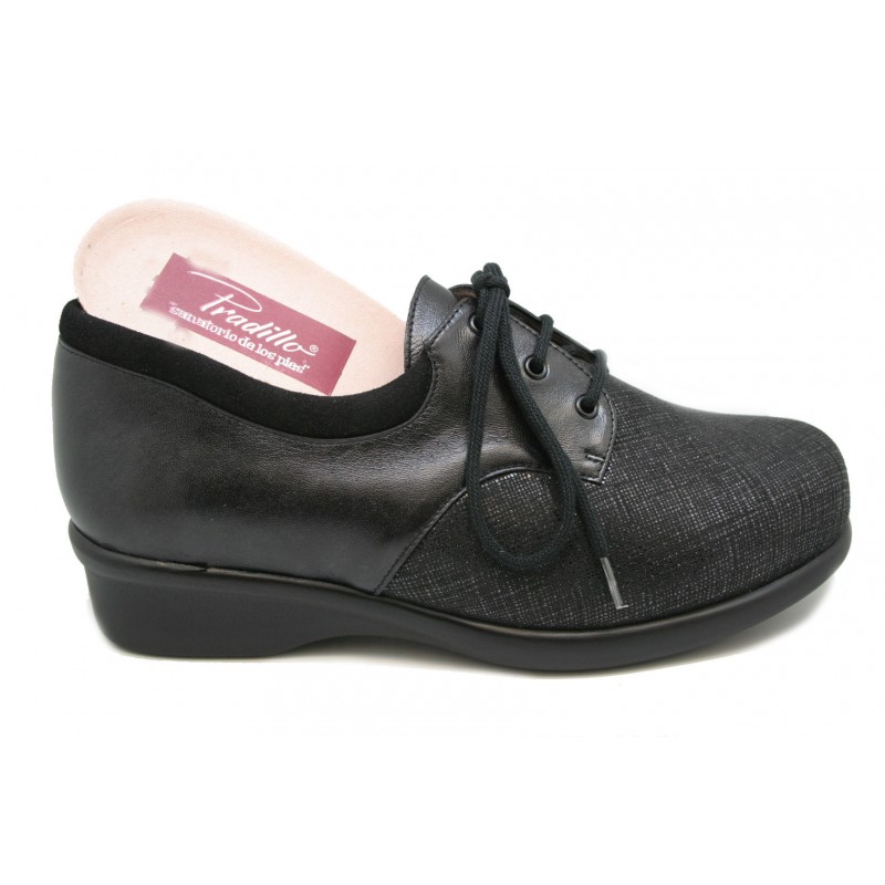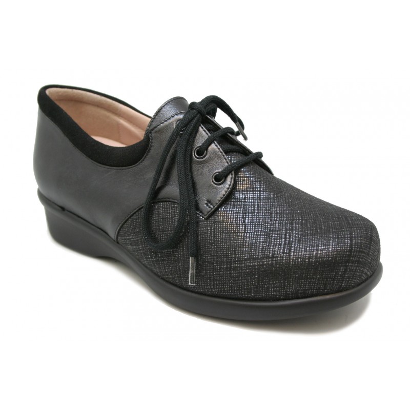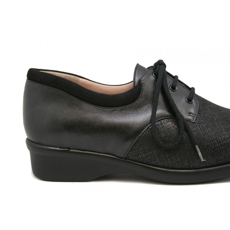 Zapato muy cómodo y ancho para mujer. Fabricado en piel y licra color negro. Cordones ajustables al empeine. Plantilla extraíble con posibilidad de acoplar la plantilla ortopédica del cliente. Zapato para personas con los pies anchos y delicados, al ser la pala elástica es ideal para los dedos en garra o juanetes. Piso de poliuretano.