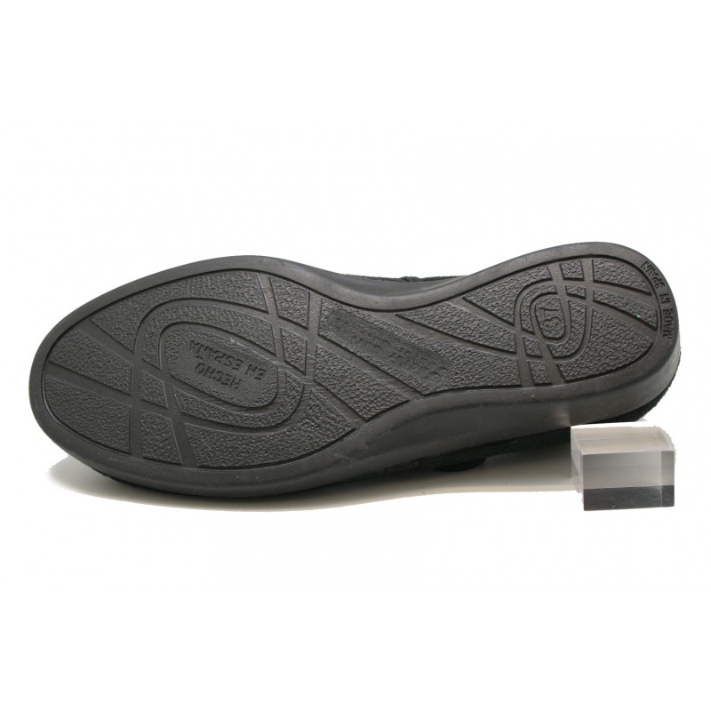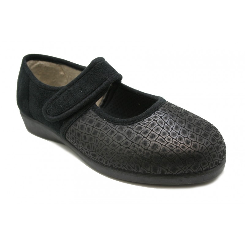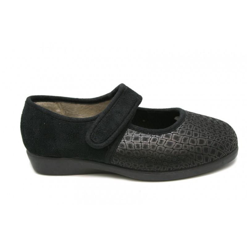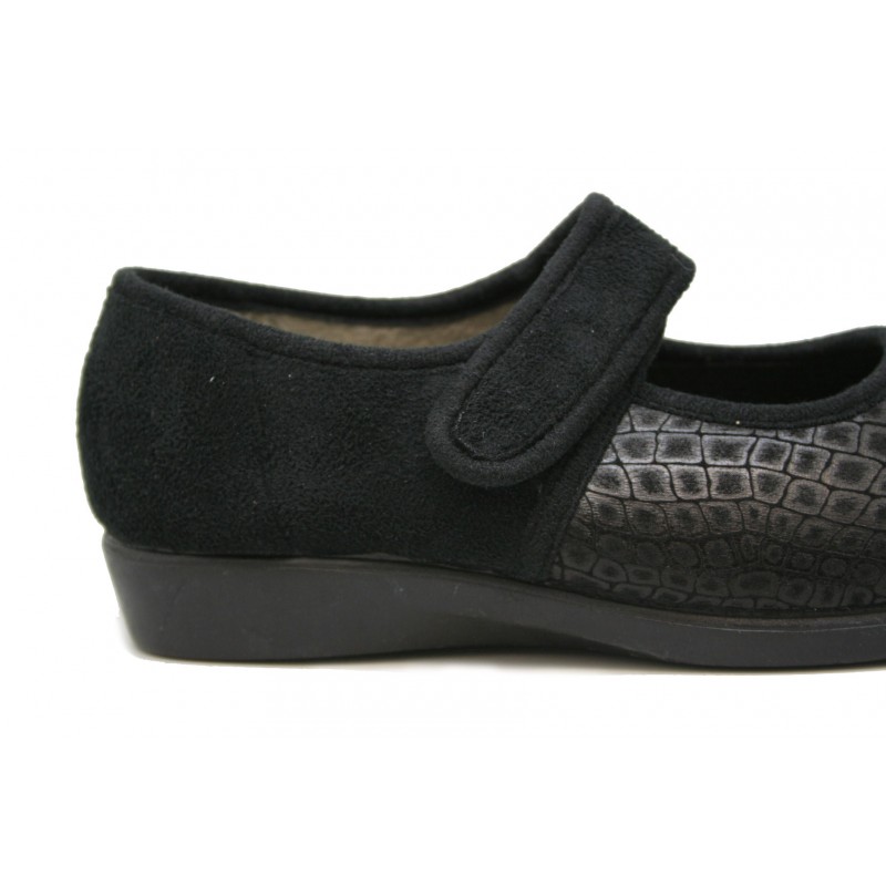 Fantástica zapatilla en ancho especial para mujer. Fabricada en suapel negro y lycra elástica con dibujos. Pespustes y veldro negros. Forro mouton muy cálido. Piso de goma antideslizante.
