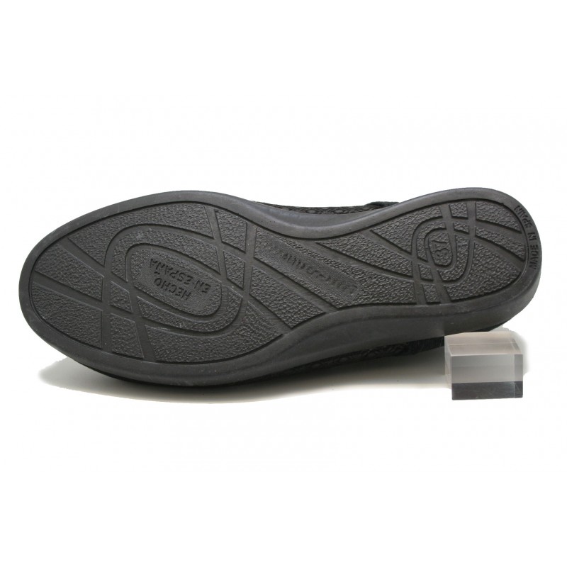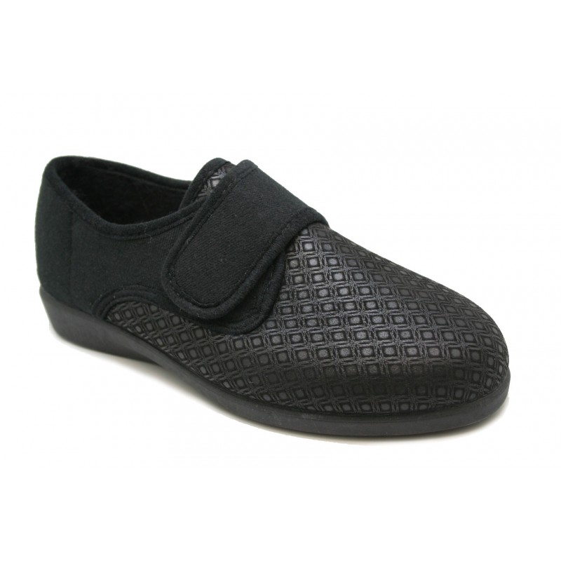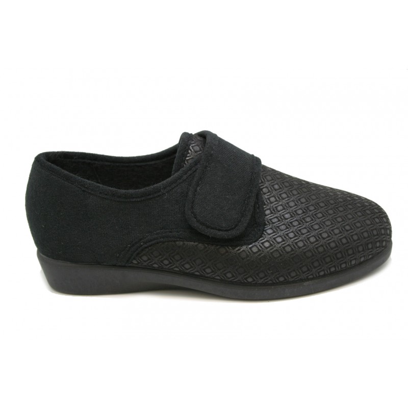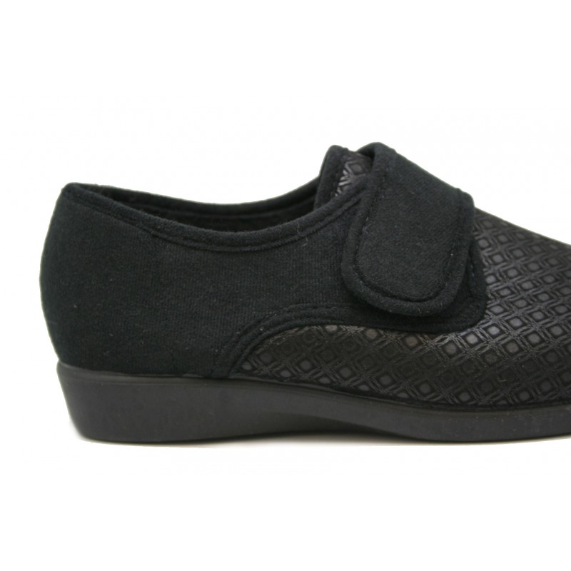 Zapatilla ancha y cómoda para mujer. Fabricada en suapel negro con la pala en lycra elástica. ideal para pies con juanetes o dedos en garra. Forro de lycra. Piso de goma.