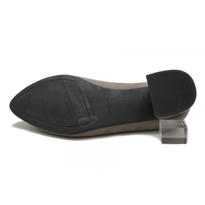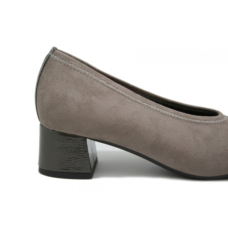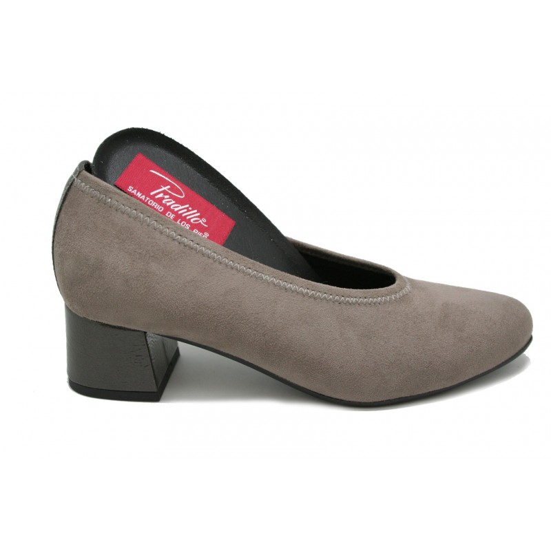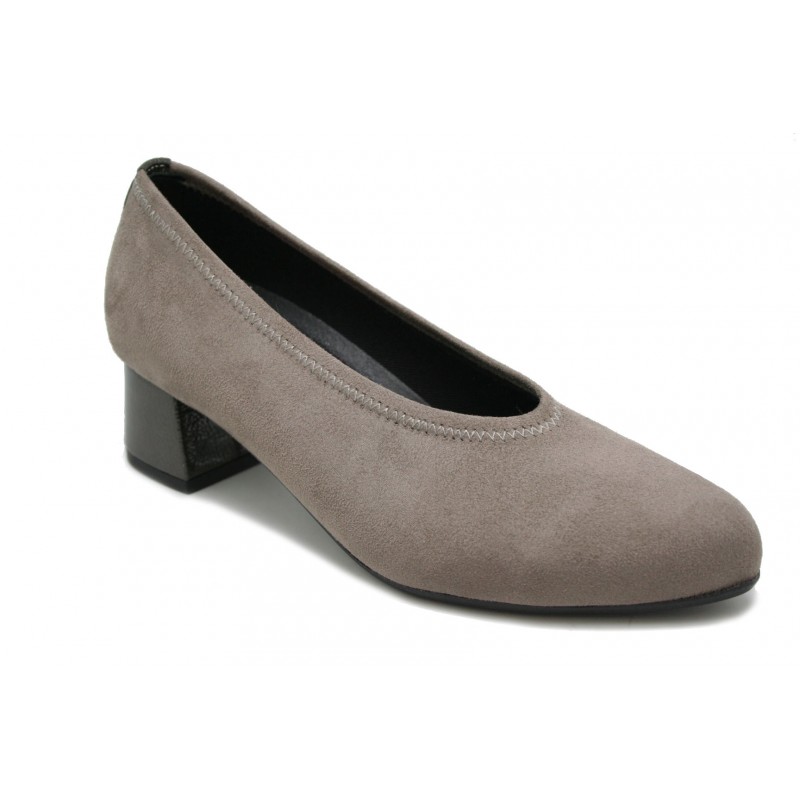 Zapato salón de mujer para vestir. Fabricado en ante elástico color taupe. Plantilla extraíble que se puede intercambiar por la del cliente. Tacón ancho y cómodo para caminar.