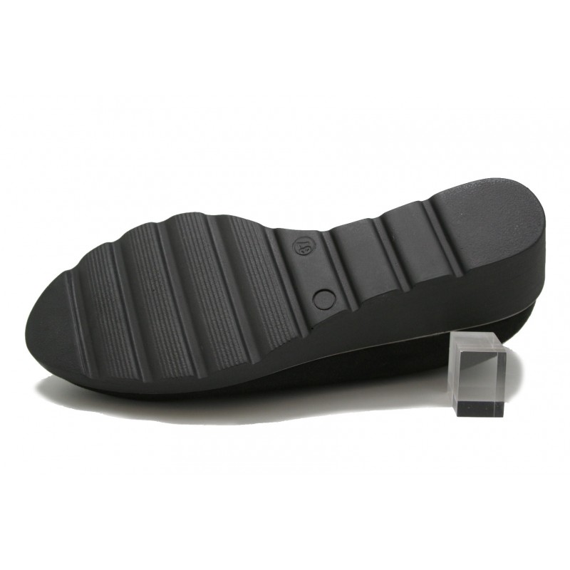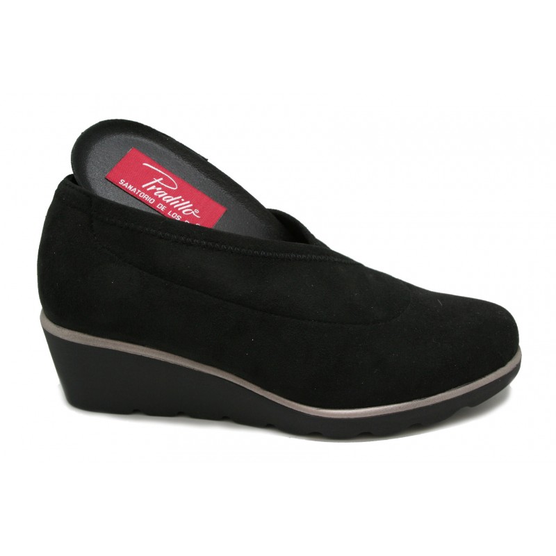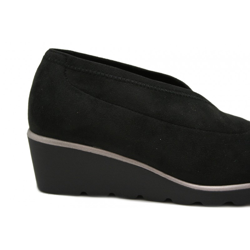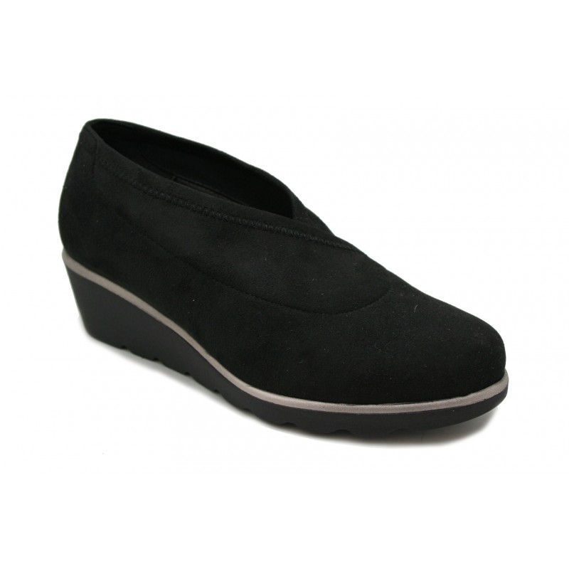 Zapato tipo mocasín alto, fabricado ante elástico color negro. Plantilla extraible. Piso cuña alto, muy cómodo a pesar de la altura.