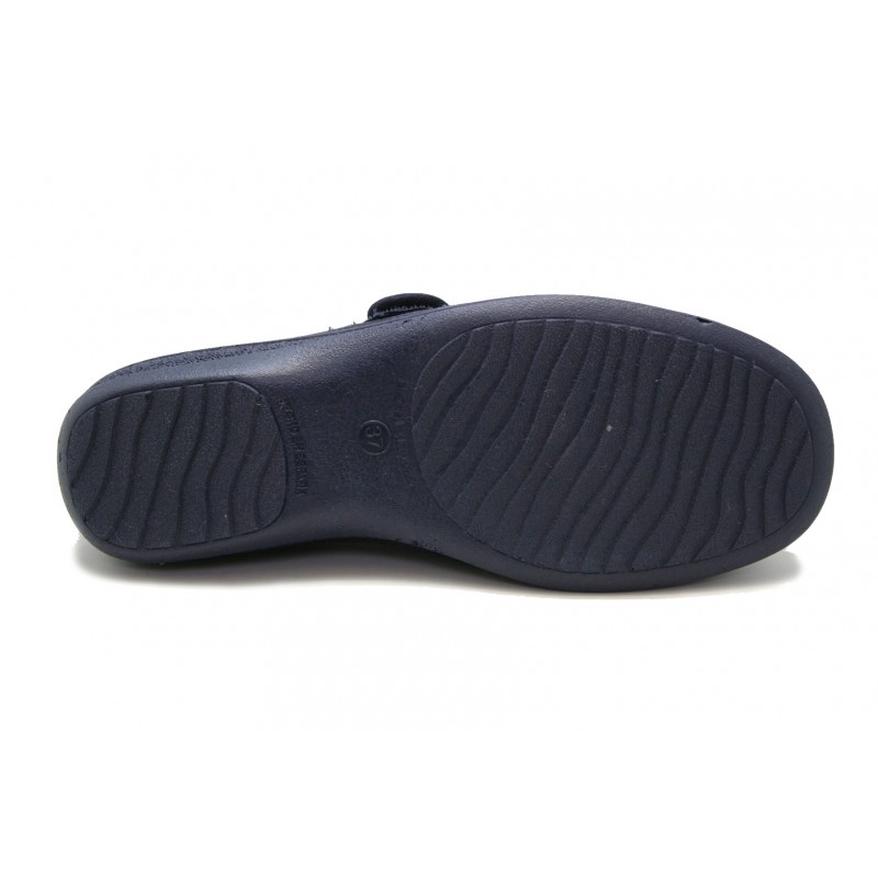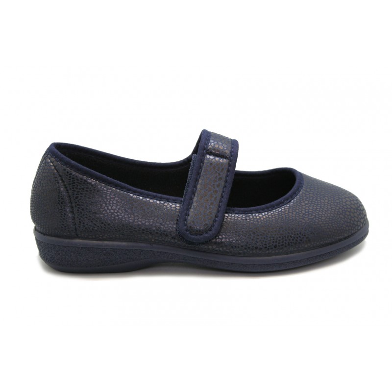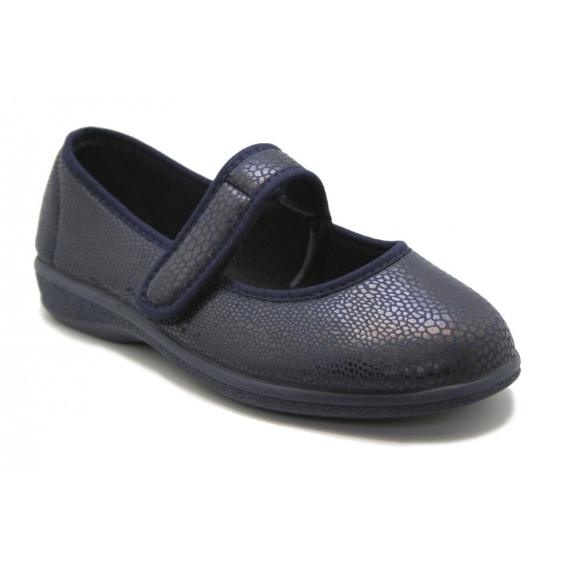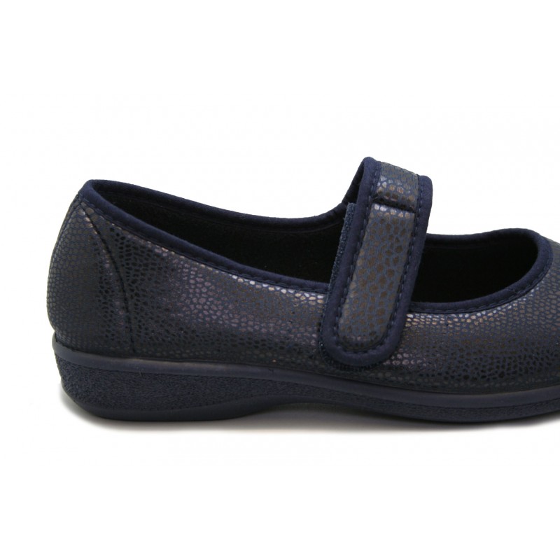 Zapatilla para juanetes fabricada en lycra azul marino. Escote redondo con tira mercedes al empeine. PLanta y forro textil negro. Piso de goma azul marino. Pespuntes y velcro al tono.
