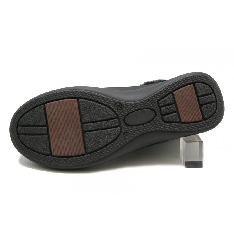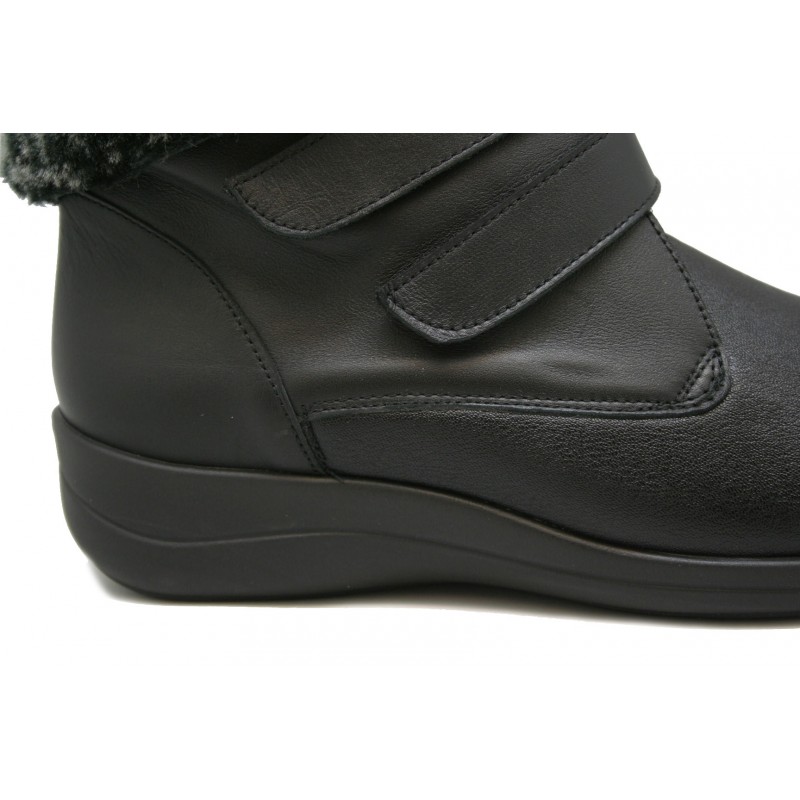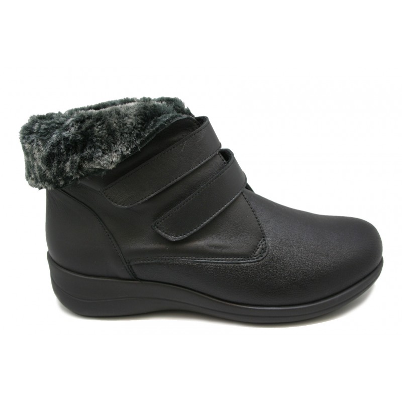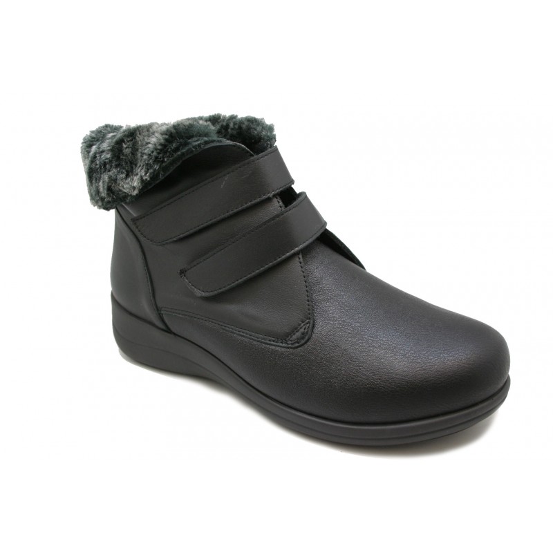 Cómodo y ancho botín para mujer. Fabricado en piel y piel elastica color negro. Adorno de pelo en cuello. Dos velcros ajustables al empeine, para facilitar la entrada del pie. La pala al ser elástica es ideal para pies anchos y delicados. Forro textil y lycra. Plantilla extraíble con arco y metatarso. Botín ideal para pies difíciles. Piso antideslizante.