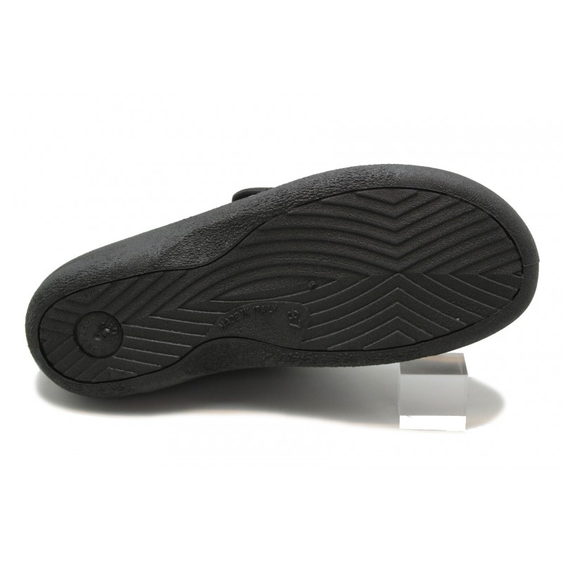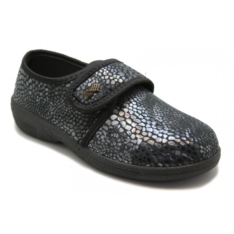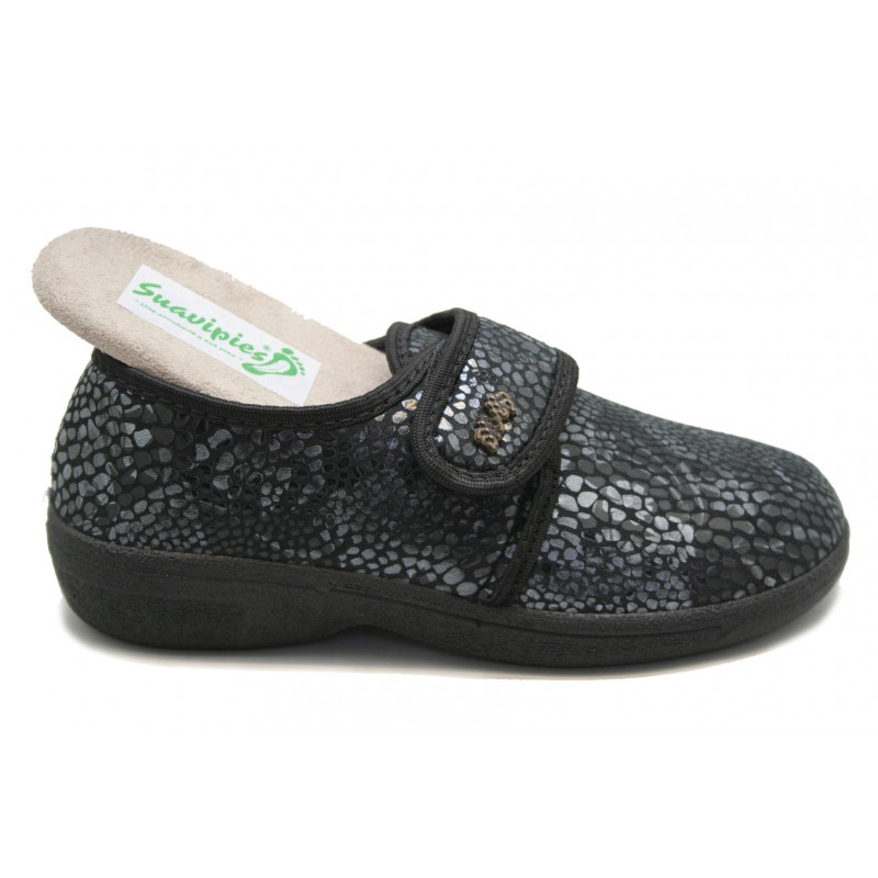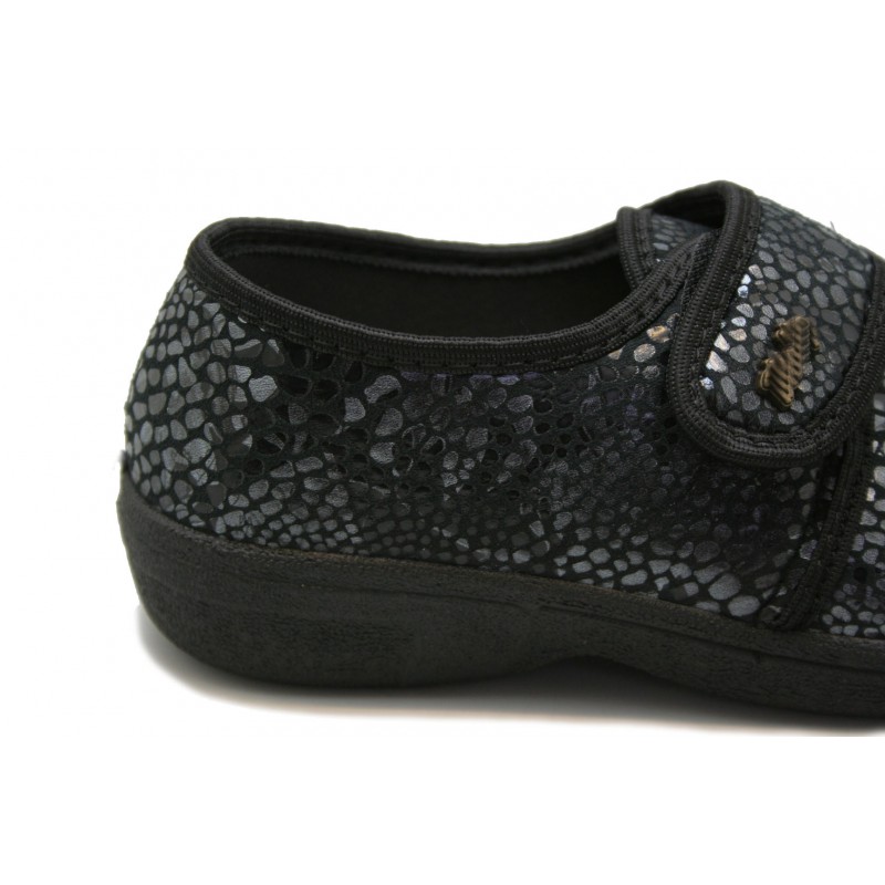Original zapatilla muy ancha y cómoda, fabricada en lycra imitación serpiente grabada negra. Vivos, pespuntes y velcro negro. Forro de lycra adaptable color negro. Plantilla mullida y extraíble. Piso de goma tipo casco de 2,5cm. con plataforma de 1cm. aislante del pavimento.