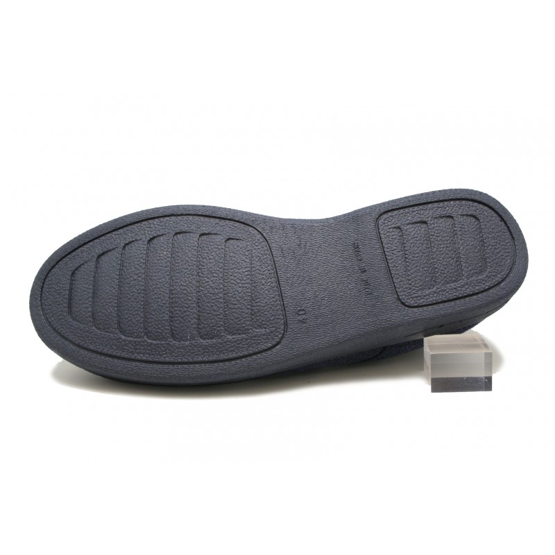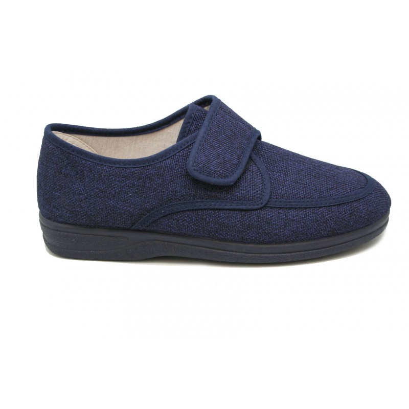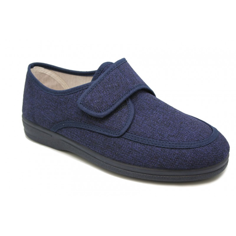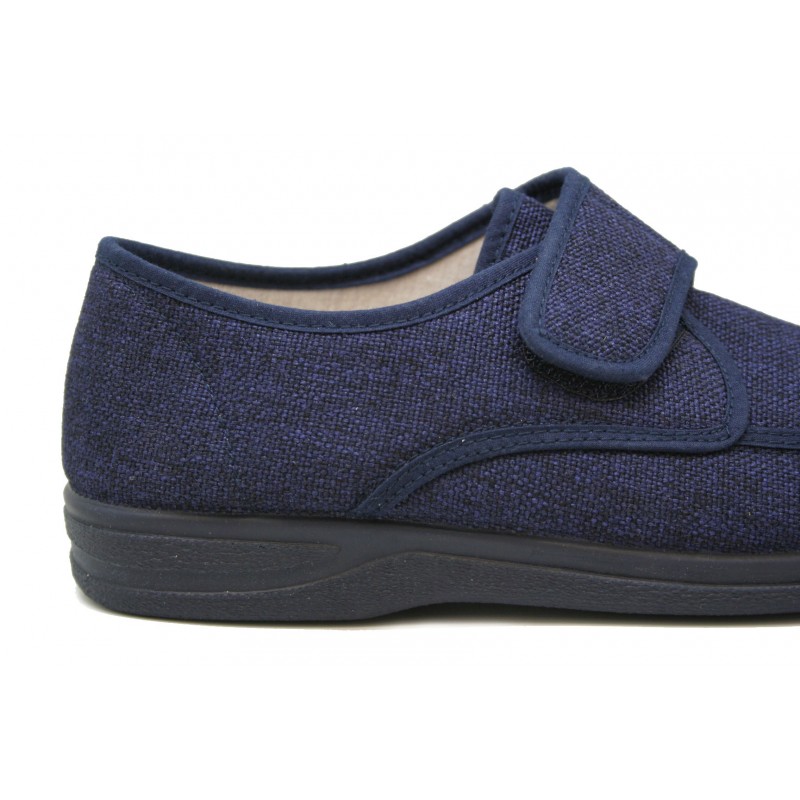 Ancha y cómoza zapatilla para hombre fabricada en tejido azul marino. Velcro en empeine para el mejor ajuste del pie. Plantilla extraíble. Forro sanitized. Piso de goma.