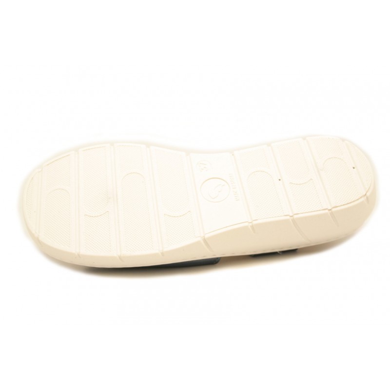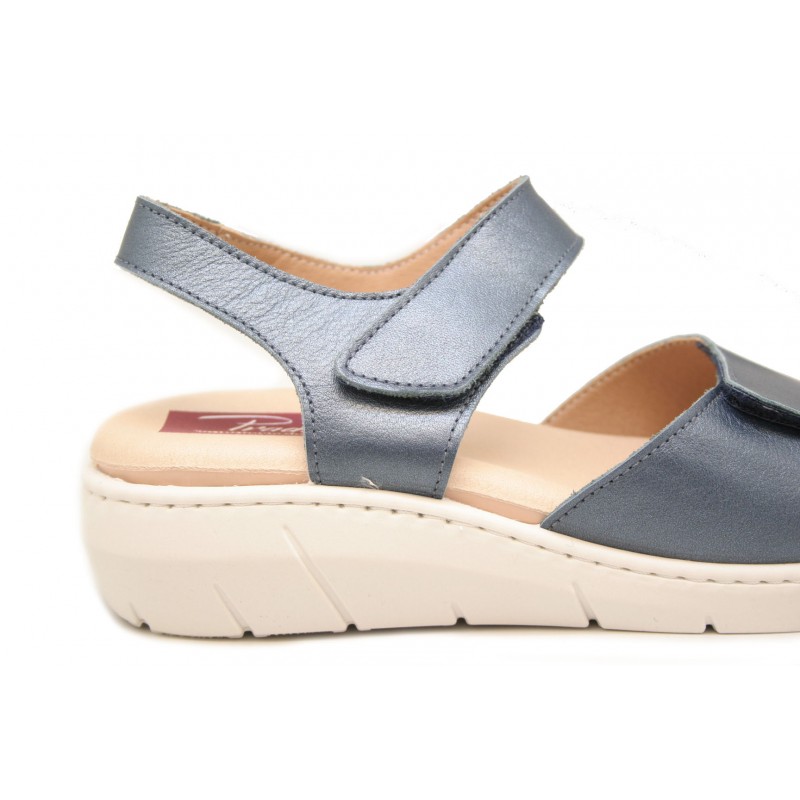 Sandalia cómoda y juvenil para mujer. Fabricada en piel color azul marino. Velcro en dedos y tobillo para el mejor ajuste del pie. Plantilla mullida ideal para pies delicados. La plantilla es extraíble pero no intercambiable. Piso cuña de goma color horchata.