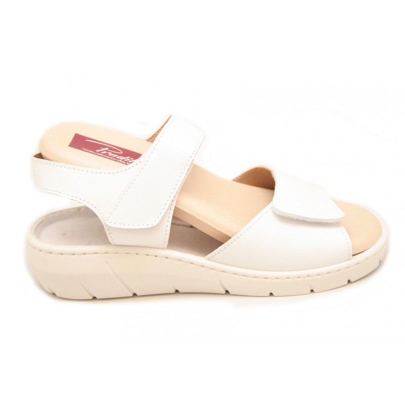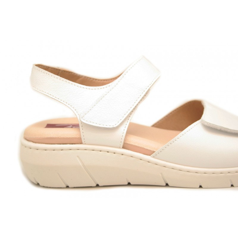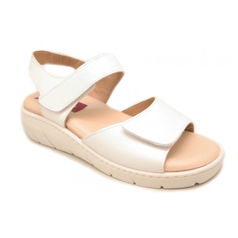 Sandalia cómoda y ancha para mujer. Fabricada en piel color blanco. Lleva dos velcros ajustable para las necesidades de cada pie. Plantilla mullida forrada en piel. Piso de cuña color horchata.