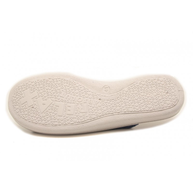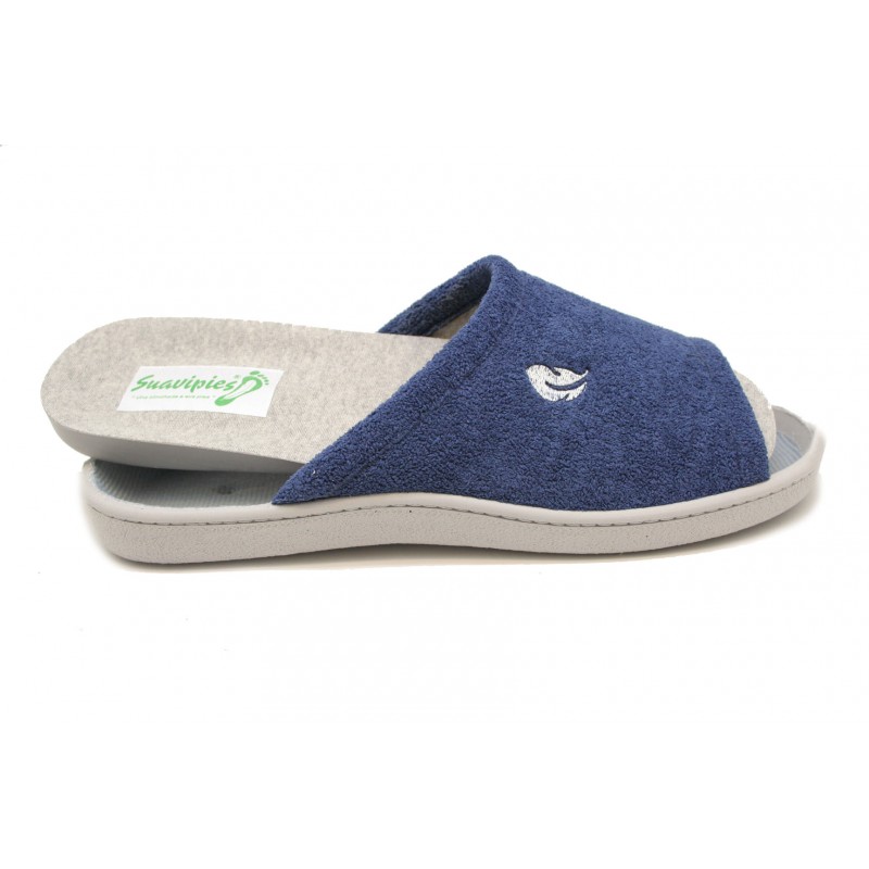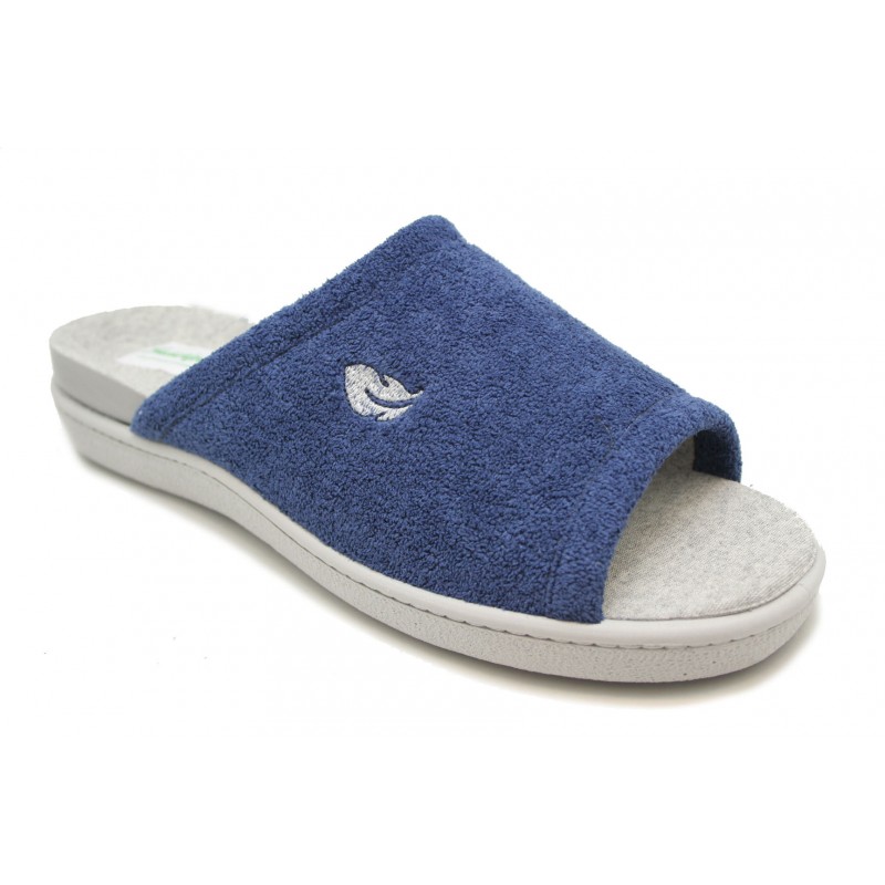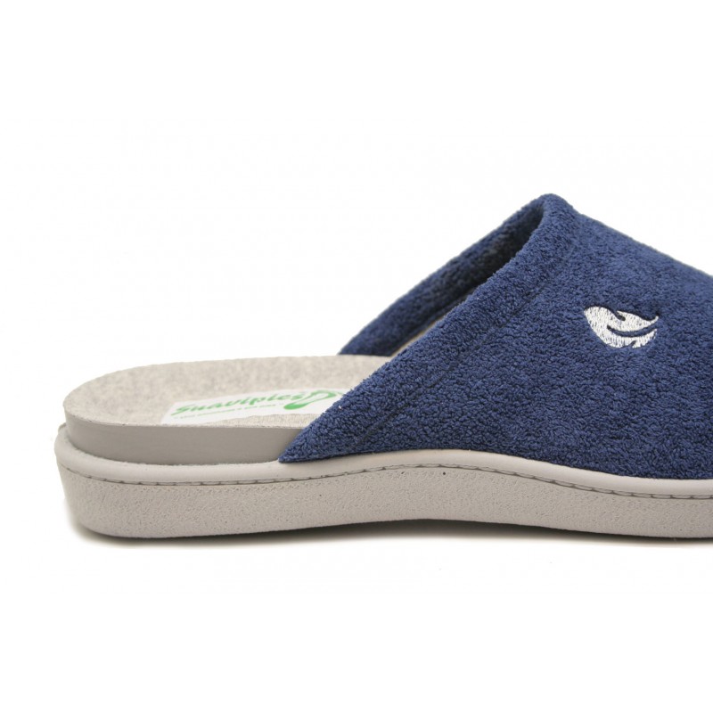 Cómoda chinela para hombre fabricada en tejido rizo color marino. Plantilla mullida con efecto memoria extraíble forrada en tela. Piso antideslizante.