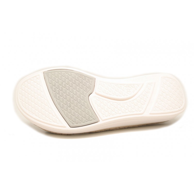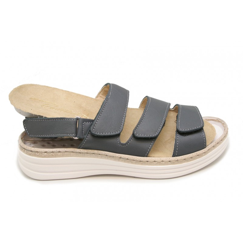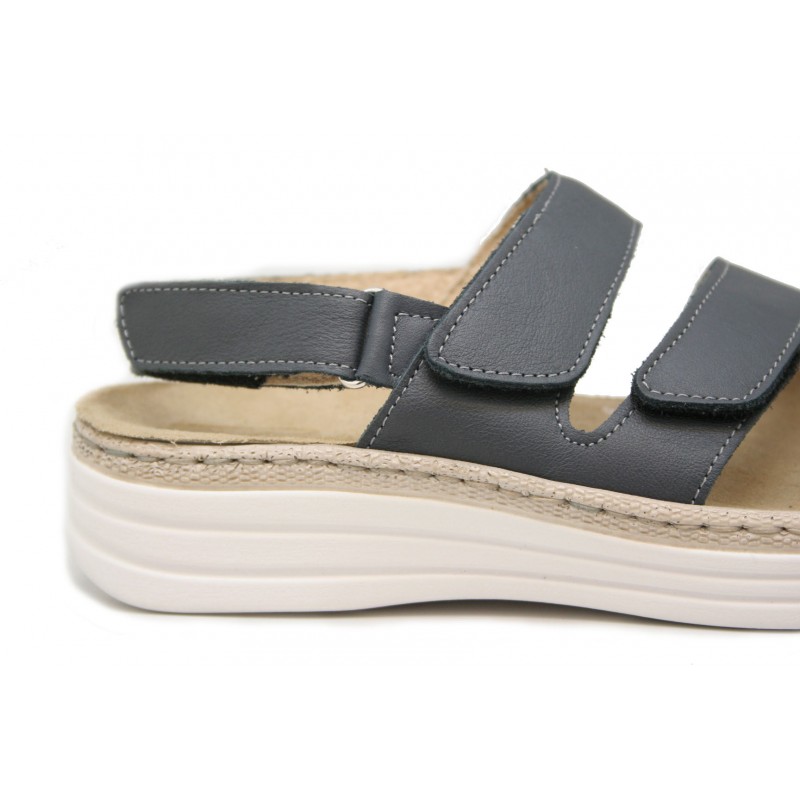 Sandalia para mujer fabricada en piel color azul marino, tres velcros ajustables en dedos, empeine y tobillo. Plantilla extraíble aunque no intercambiable. Piso casco color blanco y oro. Fresca y cómoda para verano.