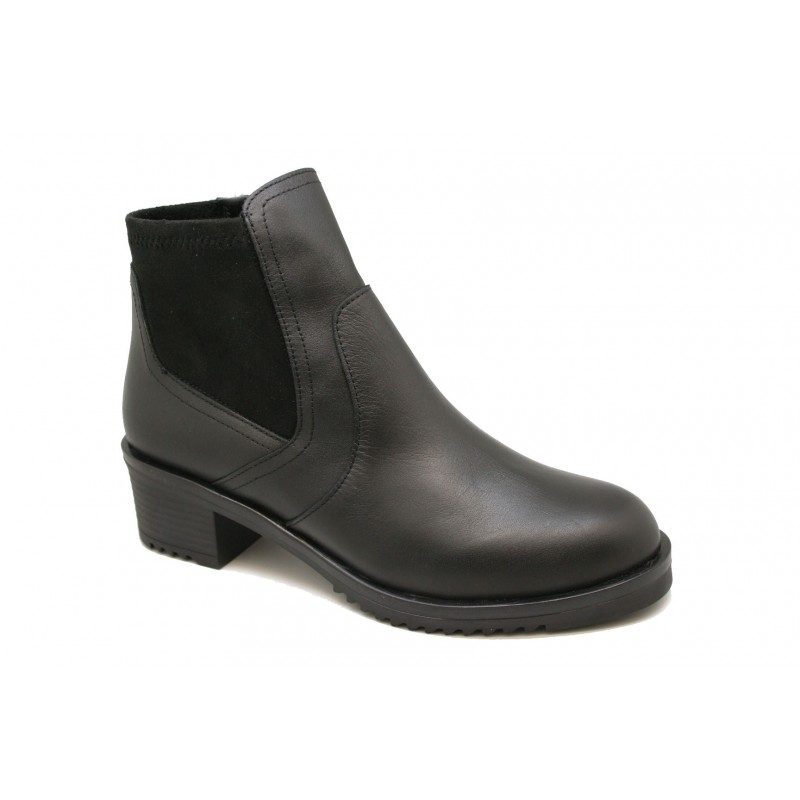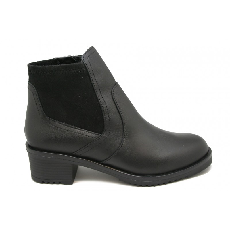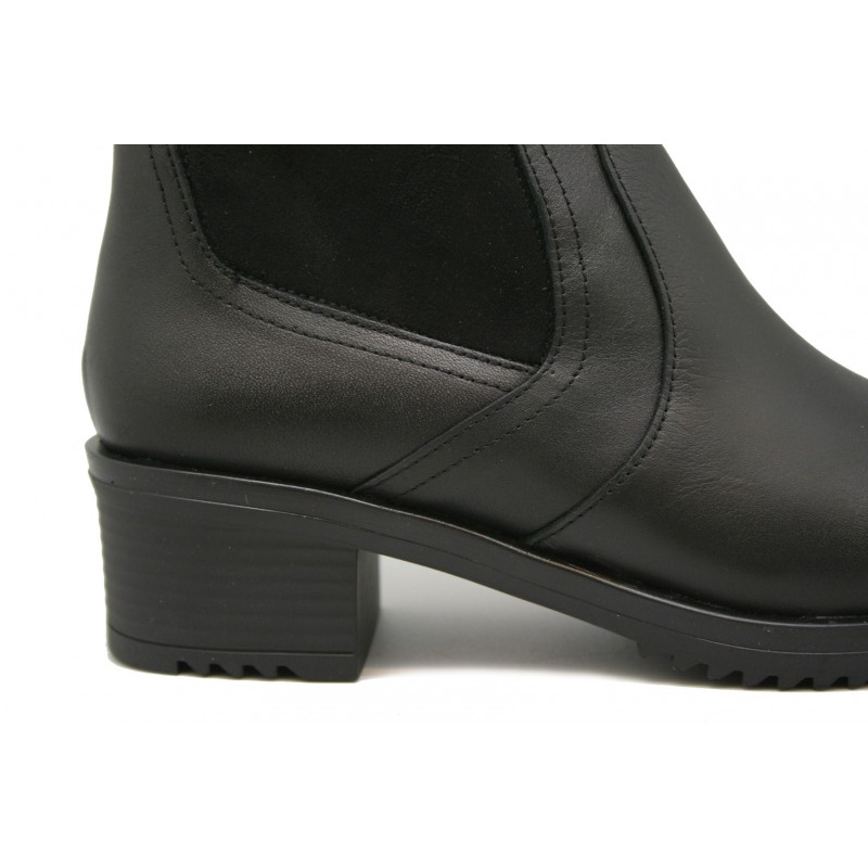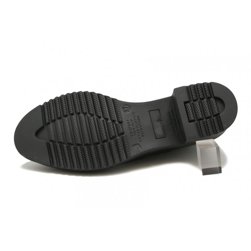 Exclusivo botín de Pradillo fabricado en nappa negra con elástico al tono. Moderno, joven y cómodo. La plantilla ortopédica es extraíble e intercambiable por la del cliente. Piso con plataforma de 1cm. y tacón descanso de 3,5 cm. También tiene cremallera interior.