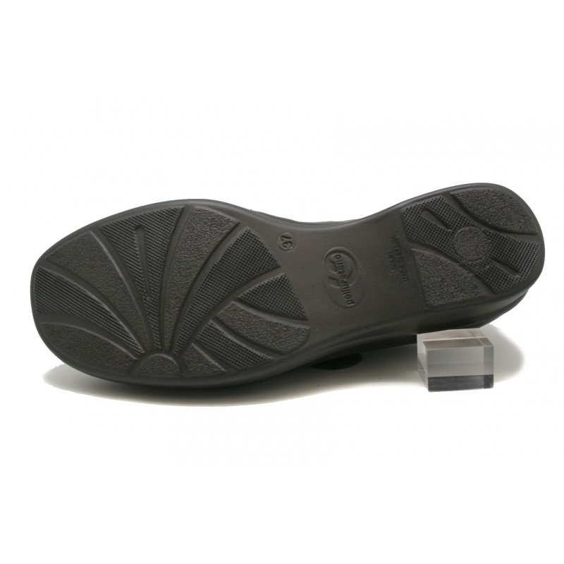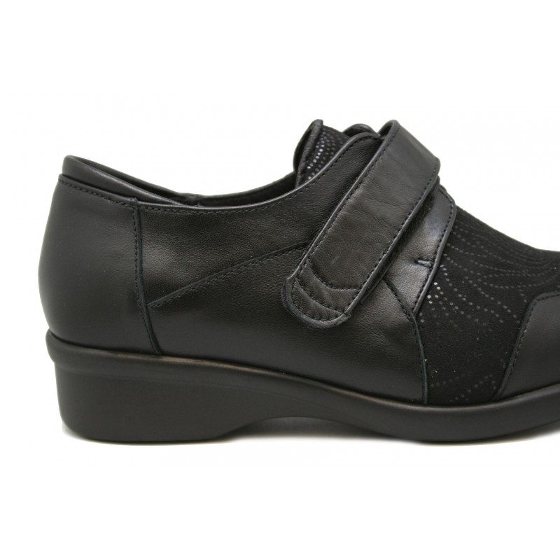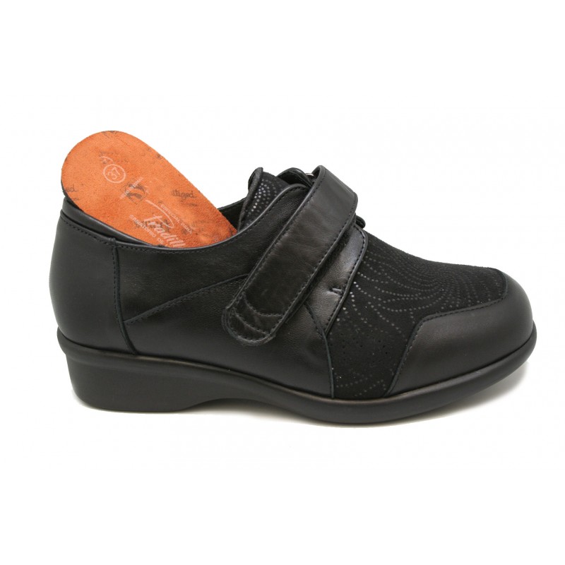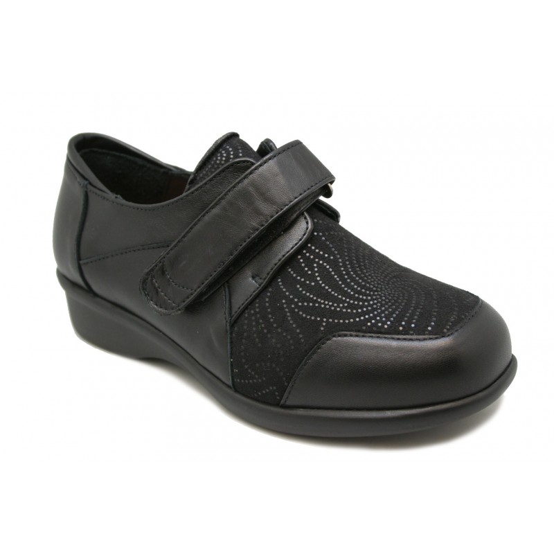 Zapato de ancho especial muy cómodo con plantilla extraíble para mujer. Fabricado en nappa negra con la pala en lycra grabada al tono. Modelo especial para pie diabético y pies con dificultades como juanetes, dedos en garra ó retención de liquidos. Velcro de ida y vueta ideal para empeines elevados. La plantilla que lleva el zapato es de viscolatex de 5mm de espesor y va incluida en el precio.
