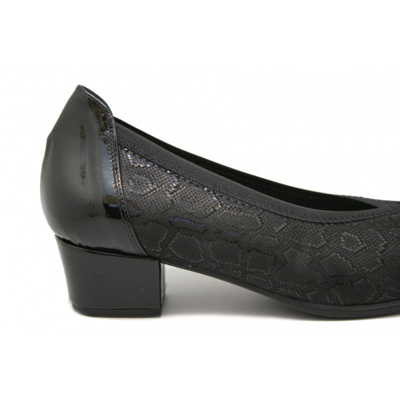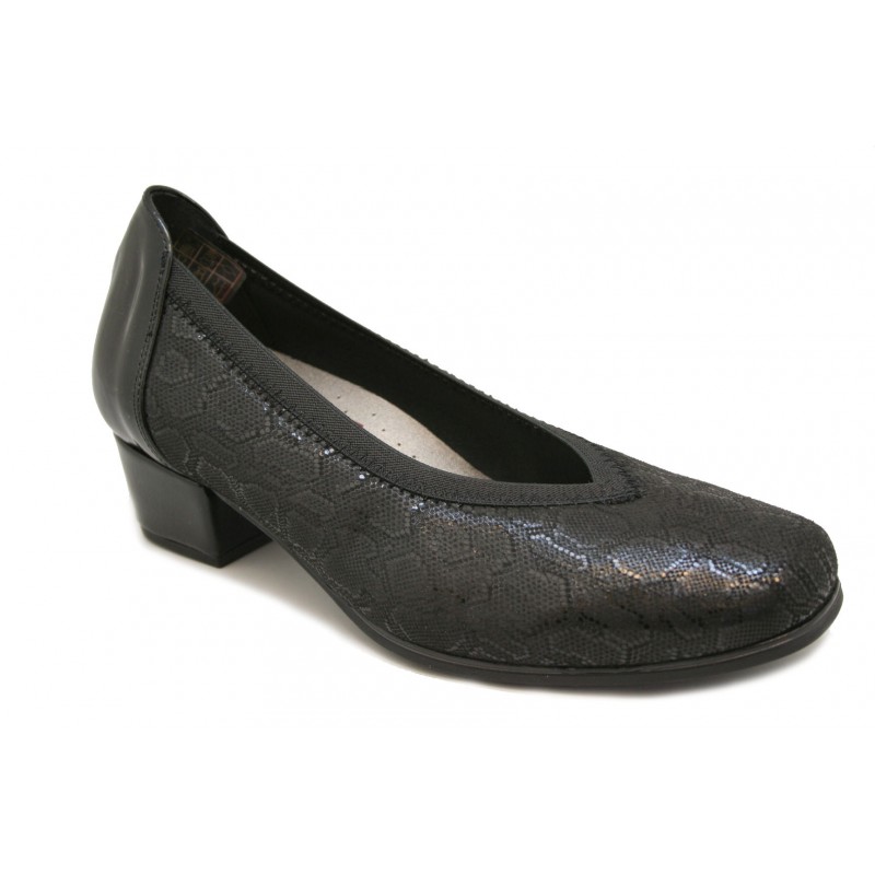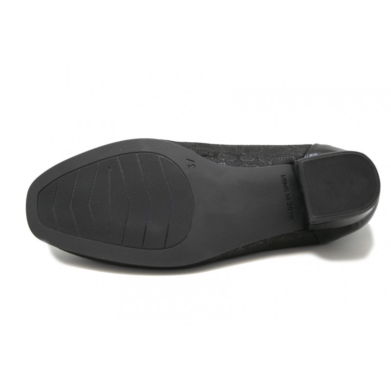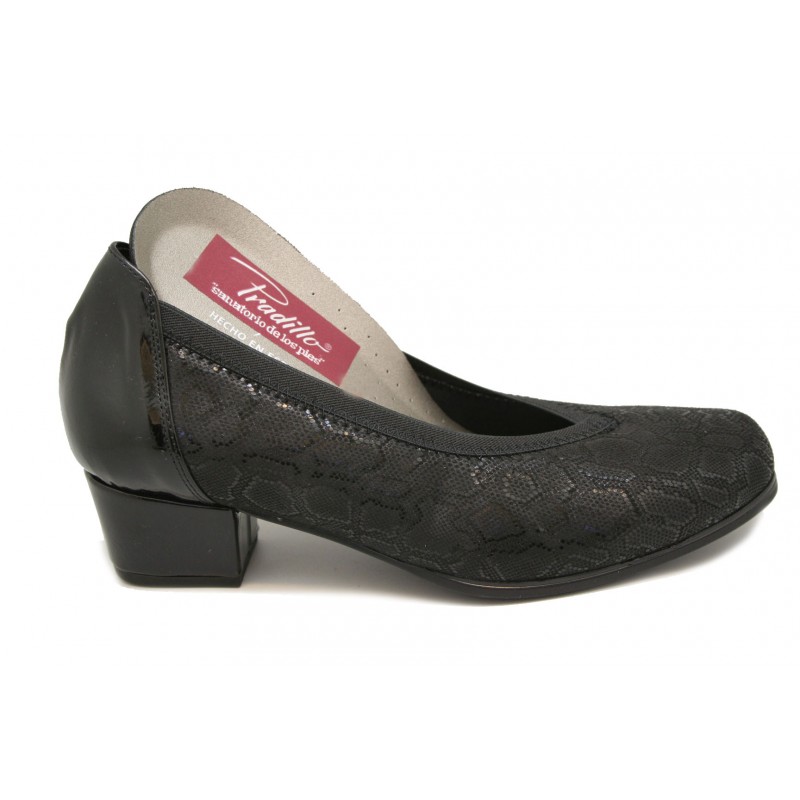 Cómodo zapato con escote en pico y plantilla extraíble para mujer. Fabricado en una suave lycra grabada negra con la trasera y tacón en charol negro. Elástico en boca para el mejor ajuste del pie. La plantilla es intercambiable por la del cliente. Tacón cubano muy cómodo.